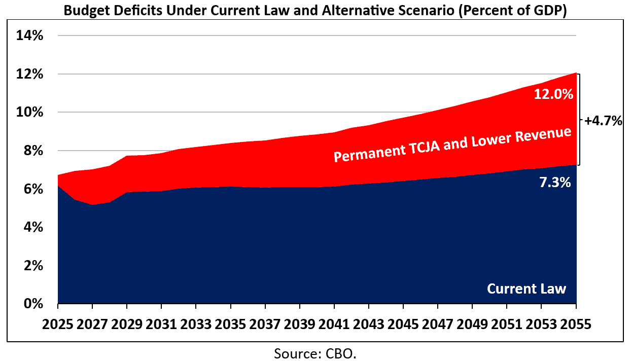 The Congressional Budget Office’s (CBO) March 2025 Long-term Budget Outlook projects that federal debt held by the public will rise from 100 percent of gross domestic product (GDP) at the end of fiscal year (FY) 2025 to 156 percent of GDP by the end of 2055 under current law. Meanwhile, the budget deficit will grow from 6.2 percent of GDP ($1.9 trillion) to 7.3 percent of GDP ($6.4 trillion) and interest payments on the national debt will climb from 3.2 percent of GDP ($952 billion) to 5.4 percent of GDP ($4.8 trillion). In a recent letter, CBO analyzed the long-term budgetary and economic impact of an alternative scenario that assumes a permanent, unpaid-for extension of the Tax Cuts and Jobs Act of 2017 (TCJA) and lower federal revenue collections than projected under current law. The scenario would increase debt, deficits, and interest costs substantially relative to current law. The average interest rate on federal debt would be higher while economic output and income per person would be smaller.