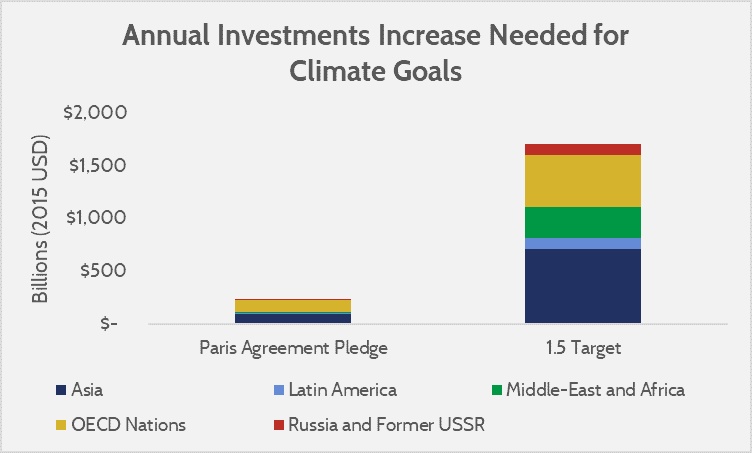 Scholars have been attempting to identify the total breadth of investment required to prevent global temperature increases from reaching 2 degrees Celsius, or even 1.5 degrees Celsius. The International Energy Agency (IEA) estimated that the cumulative global new investment required (that is, investment in clean energy beyond what is already anticipated) to remain below 2 degrees Celsius of warming is $44 trillion through 2050. A different analysis, published in World Scientific, estimated that the same 2 degree target would require a cumulative $45 trillion of investment through 2050, which was the mean value in a range between $30 – $75 trillion. The same authors of that study did another analysis to estimate the costs for a 1.5 degree target, which estimated that the required increase in investment above current investment expectations would be $1.6 trillion per year, or $48 trillion over 30 years. This analysis also broke the costs down by region, displayed below. Note that these costs are undiscounted, meaning they represent cumulative costs rather than present-day costs.