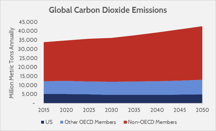 Notice from the chart above that 92 percent of carbon dioxide growth is expected to come from non-OECD members. These data illustrate a central truth that must guide any climate-policy choices: Stabilizing global GHG emissions will require dramatic changes in how poorer nations consume energy. To be sure, the United States has an important role to play in combating climate change; the world’s second-largest emitter must pursue domestic decarbonization as a necessary condition for mitigating rising global temperatures. But domestic emissions reductions alone are not a sufficient condition to achieve widely held climate goals.
