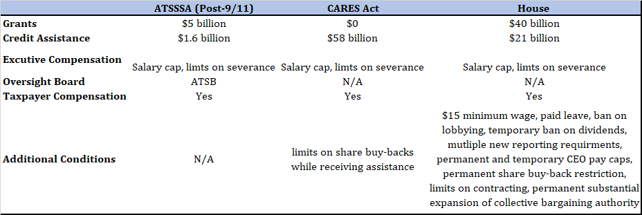 The House of Representatives is reportedly drafting competing legislation with $40 billion in direct payments to airlines and related contractors, plus an additional $21 billion in loans. However, these measures are paired with both temporary and permanent changes to these forms business practices. The House approach includes substantial new costs on participating employers including permanent new wage and collective bargaining mandates, a host of temporary restrictions and reporting requirements.