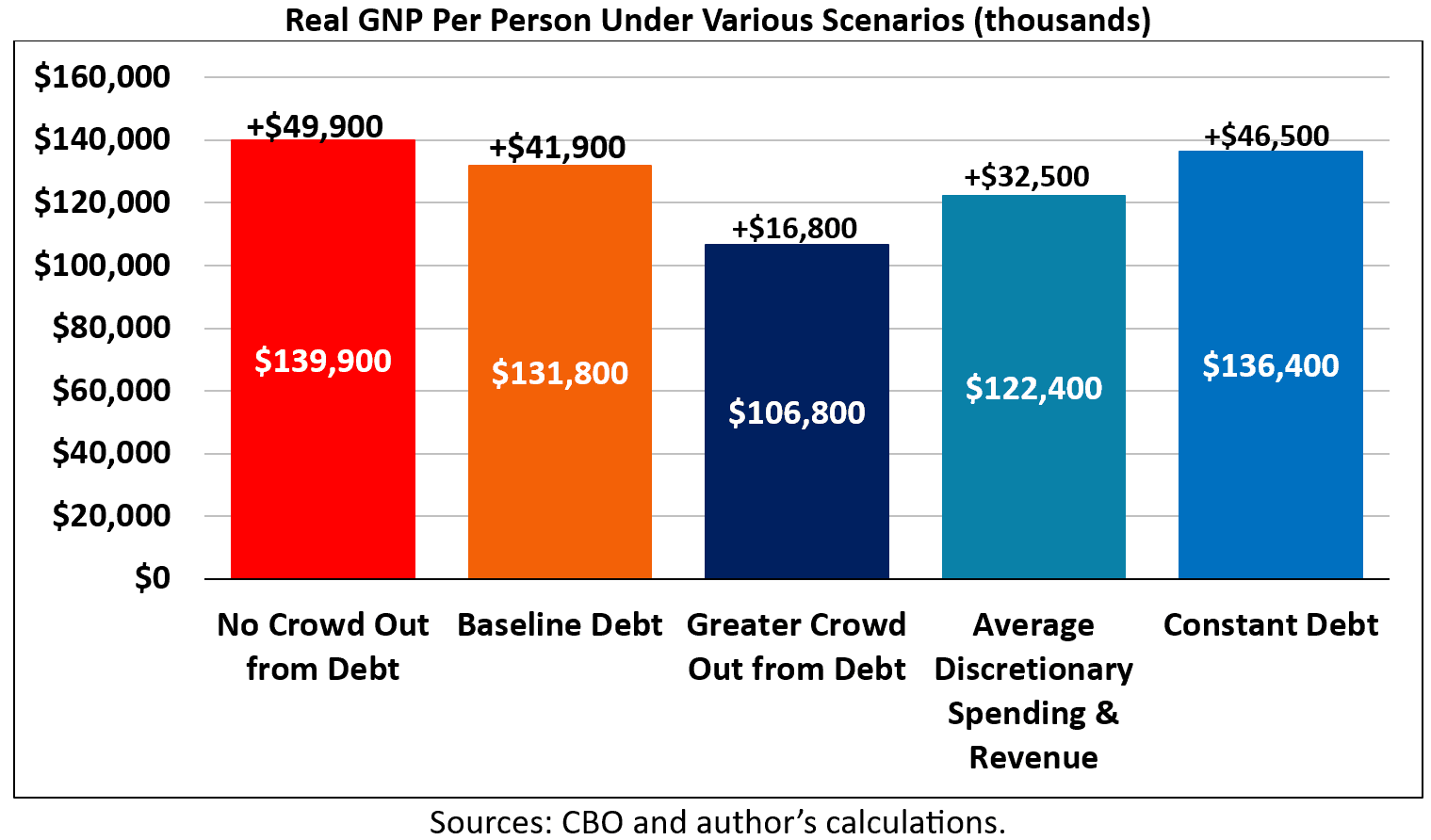 The national debt is currently 100 percent of GDP and CBO projects it will grow to 156 percent of GDP by the end of FY 2055. If one assumes that subsequent increases in debt do not crowd out private investment, CBO estimates that average income – as measured by gross national product (GNP)[2] per capita – in calendar year (CY) 2025 inflation-adjusted dollars would increase by $49,900, from $89,900 in CY 2025 to $139,900 in CY 2055.
