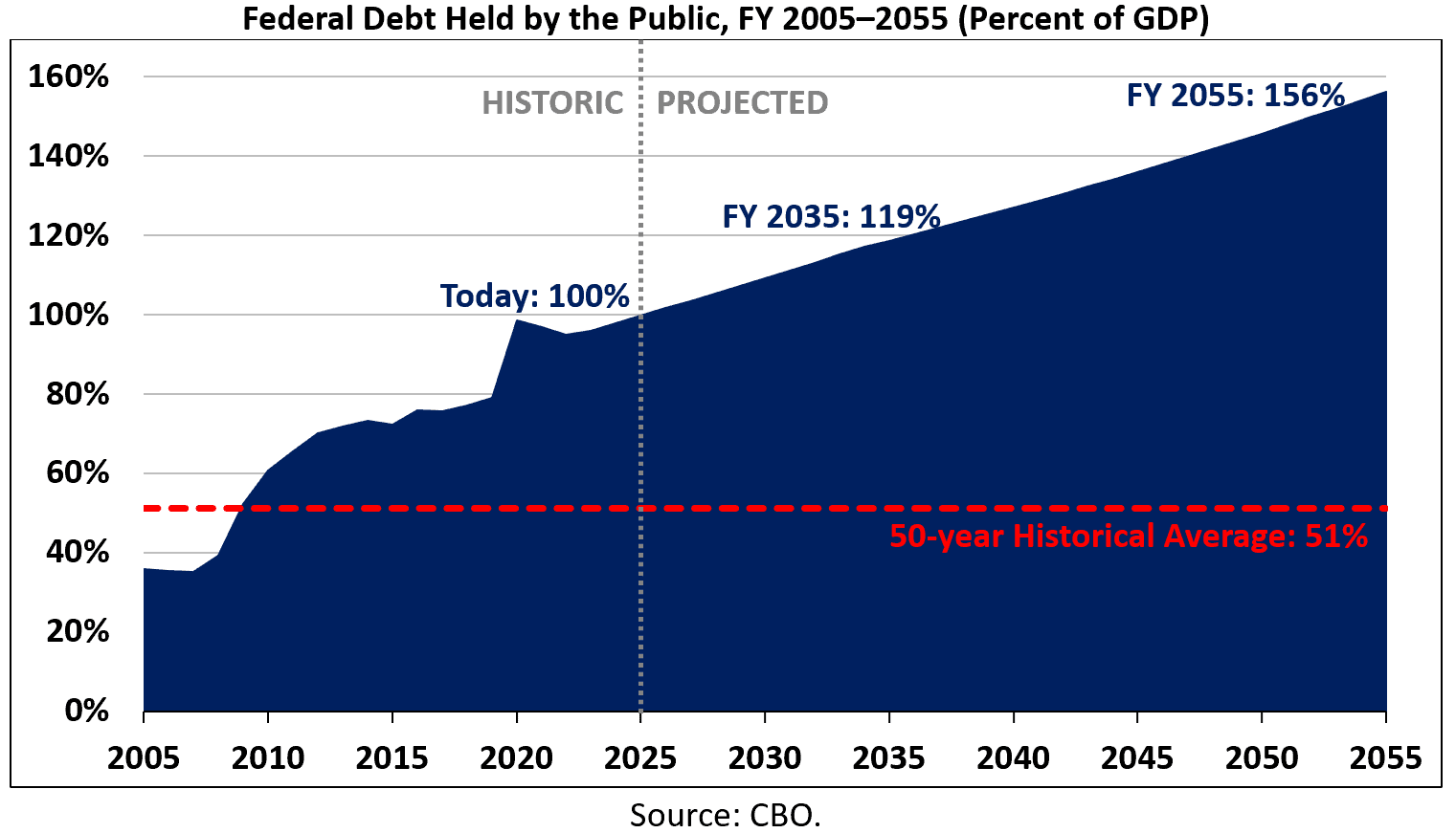 The United States faces a litany of fiscal challenges, the most consequential of which is the unsustainable growth of the national debt. At the end of fiscal year (FY) 2025, federal debt held by the public[1] totaled $30.3 trillion – the equivalent of 100 percent of gross domestic product (GDP). The Congressional Budget Office (CBO) estimates the national debt will grow from 102 percent of GDP ($31.9 trillion) at the end of FY 2026 to a new record of 107 percent of GDP ($35.0 trillion) by the end of FY 2029. It will grow further to 119 percent of GDP ($52.1 trillion) by the end of FY 2035, to 136 percent of GDP ($85.5 trillion) by the end of FY 2045, and to 156 percent of GDP ($138.2 trillion) by the end of FY 2055.