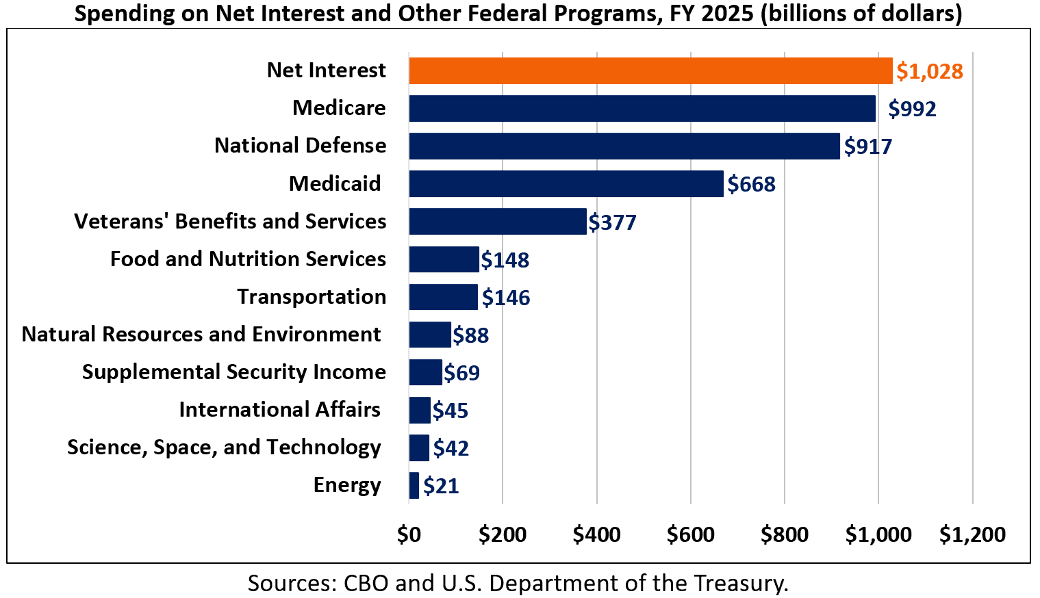 The federal government currently spends more on interest payments than it does on Medicare, national defense, Medicaid, veterans’ benefits and services, food and nutrition services, transportation, and science, space, and technology, among other federal programs.