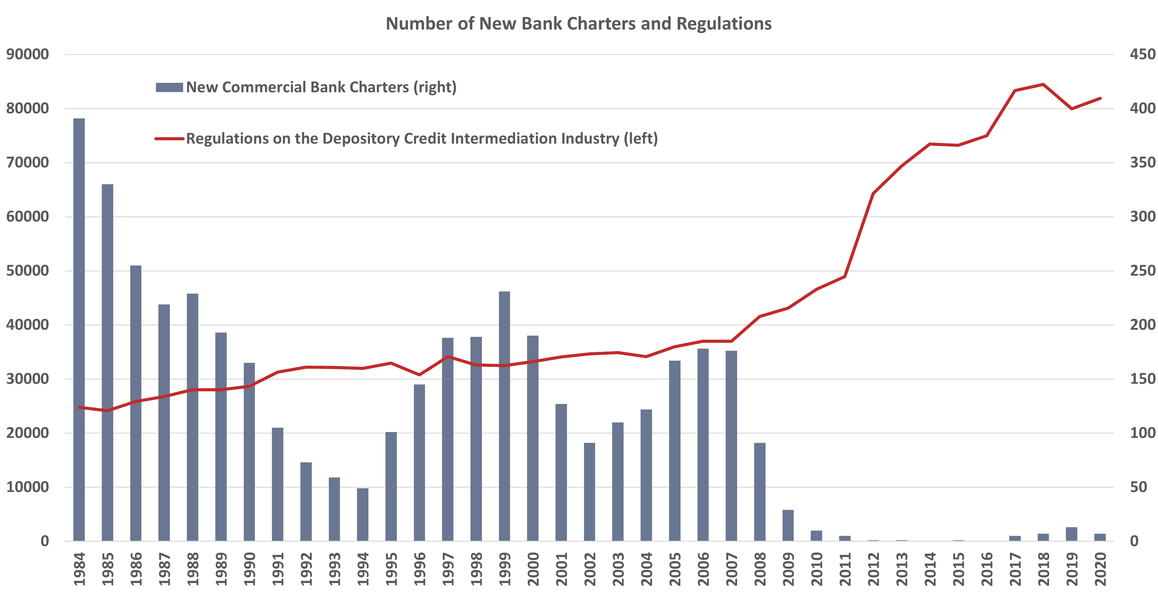 Prior to the Dodd-Frank’s passage and ensuing barrage of regulations, there was an average of 170 new bank charters issued annually between 1984–2007. In the decade following Dodd-Frank (2011–2020), the annual average plummeted to four (Figure 3). At the same time, the number of regulations on the depository credit intermediation industry – which includes commercial banks – counted by RegData went from nearly 49,000–82,000.