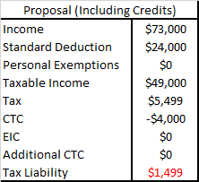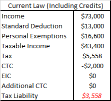 Under current law, the family would be taxed at the 10 percent and 15 percent brackets, while receiving $29,000 in combined deductions and personal exemptions ($4,150 per person), while receiving $2,000 in combined child tax credits ($1,000 per child). The hypothetical family would receive no refundable tax credits.