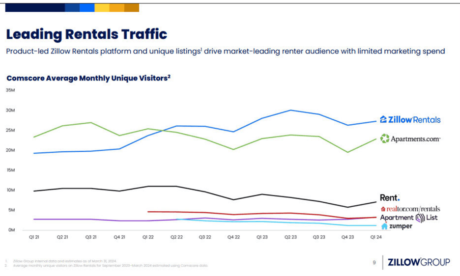 According to the FTC’s complaint, Zillow competed directly with Redfin (shown as “Rent” in Figure 1) and CoStar (which operates Apartments.com) to sell advertising to PMCs looking to rent their units. By 2024, these three firms had captured more than 85 percent of national ILS revenue, with Zillow accounting for more than half of all U.S. rental listings.