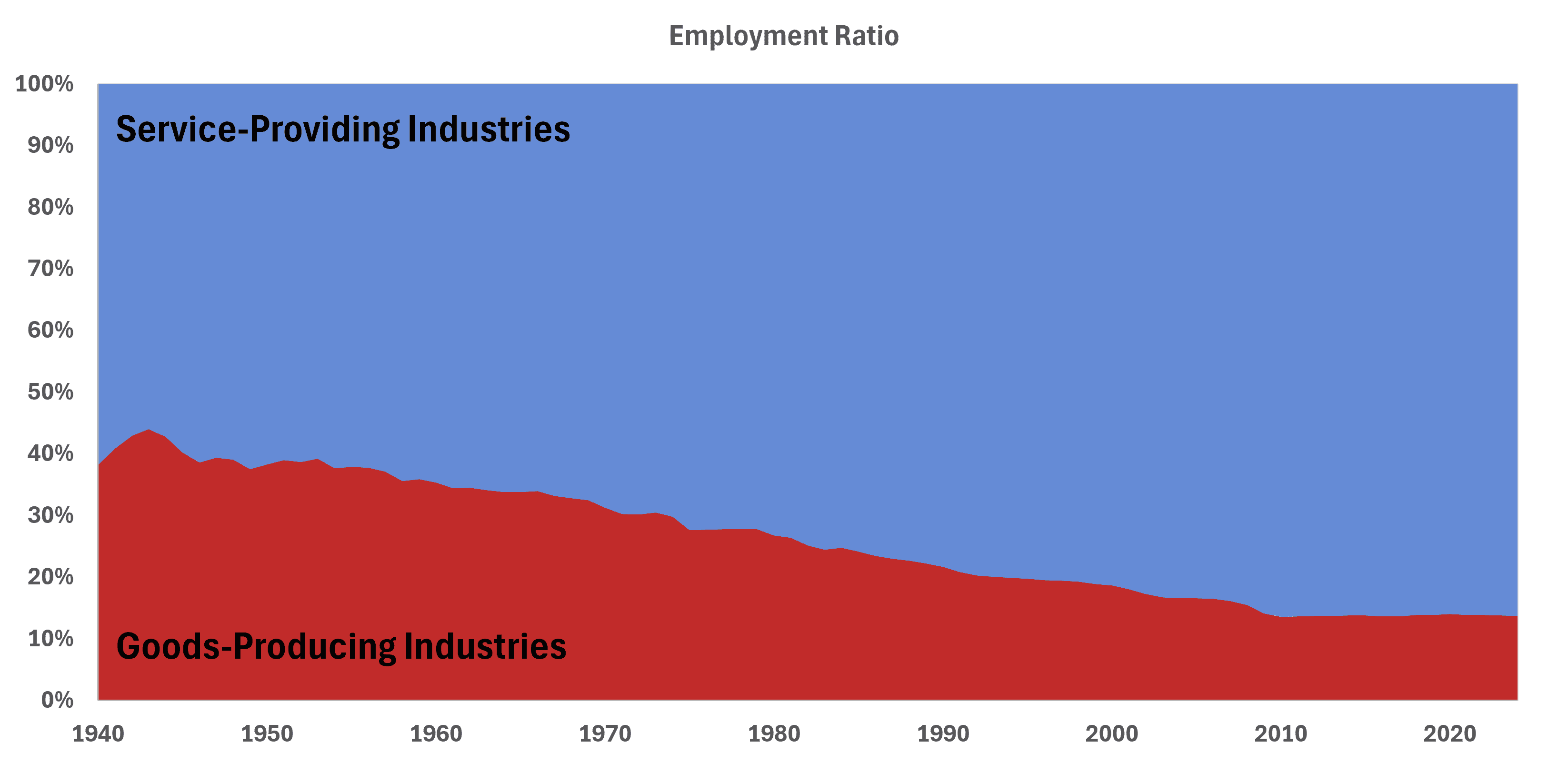 Service-providing professions are more likely to be subject to occupational licensing requirements than are goods-producing careers. This, in part, explains why the share of workers subject to occupational licensing requirements has ballooned. In 1940, 38 percent of employment was in the goods-producing sector. In 2024, goods-producing employment accounted for just 14 percent of all employment while service-providing jobs made up 86 percent (Figure1).
