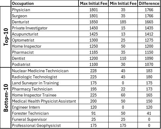 The Knee Regulatory Research Center at West Virginia University compiled data on the state-specific requirements for each occupational license, including the initial fee and the hours of hands-on experience required. Figure 3 shows the maximum and minimum fee for several occupational licenses and is organized by the difference in these fees. The 10 occupations with the greatest difference and the 10 with the smallest difference are included in the table.