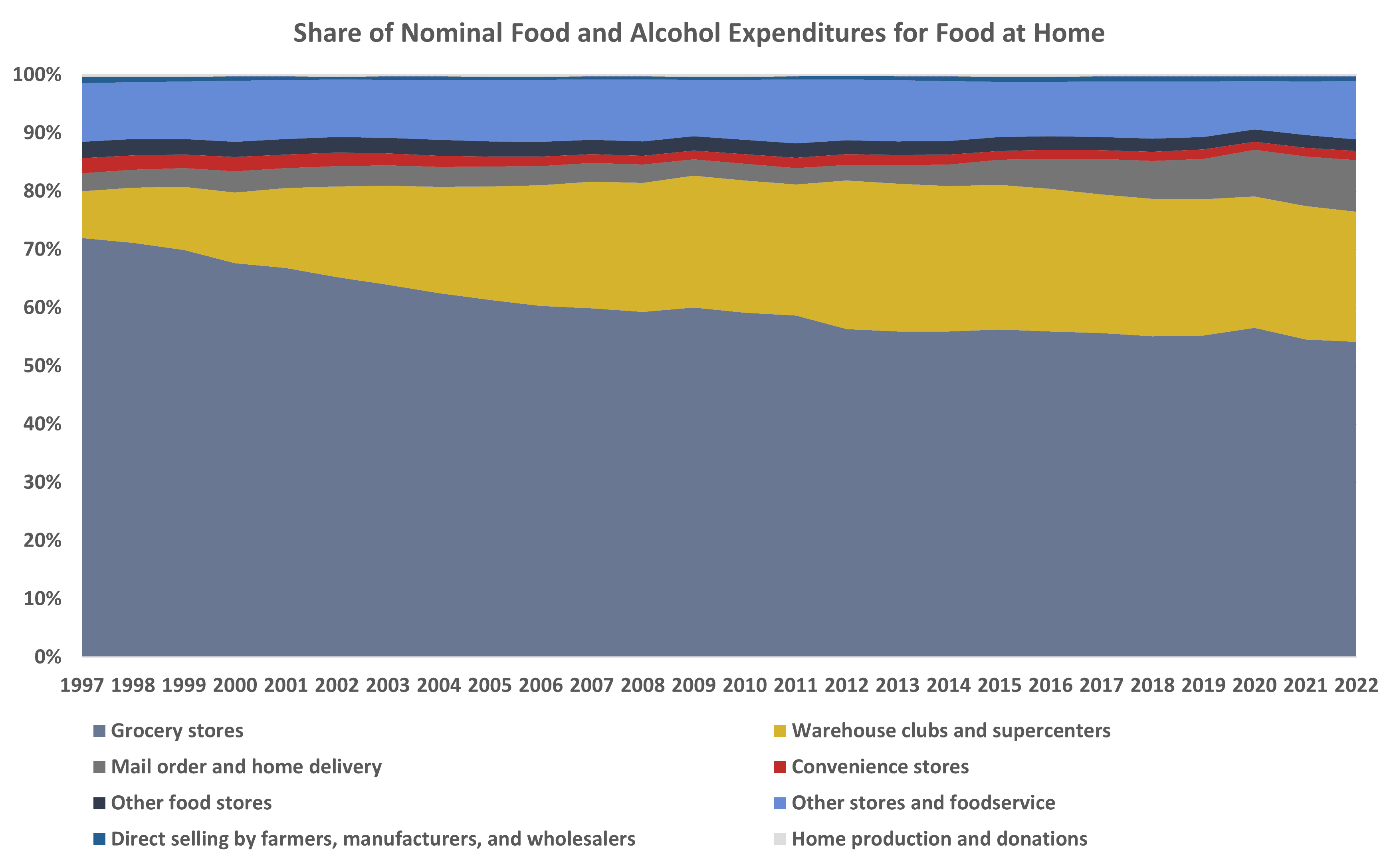 Data from the Department of Agriculture (USDA) suggest that the FTC is excluding a sizable share of the market in its analysis. In 1997, 72 percent of nominal food and alcohol expenditures for food at home were made at grocery stores, while only 8 percent were made at warehouse clubs and supercenters. By 2022, that ratio narrowed to 54 percent of food at-home expenditures made at grocery stores, a drop of 18 percentage points, and 22 percent at warehouse clubs and supercenters, an increase of 14 percentage points.