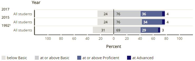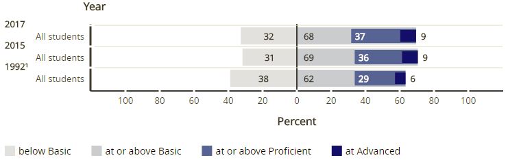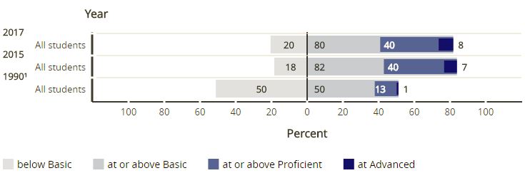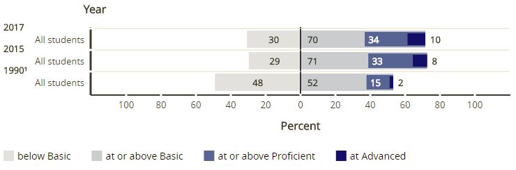 As mentioned above, results are reported as percentages of students performing at or above four achievement levels – Below Basic, Basic, Proficient, and Advanced. The charts below detail the achievement of all students comparing 1990, 2015, and 2017.
