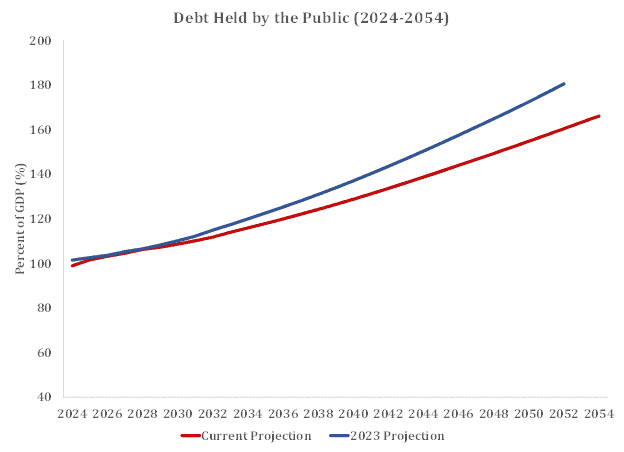 The Congressional Budget Office (CBO) released its updated Long-Term Budget Outlook and projected that U.S. debt held by the public will increase by essentially two thirds of its current levels, from 98 percent to 166 percent of gross domestic product (GDP) by 2054.