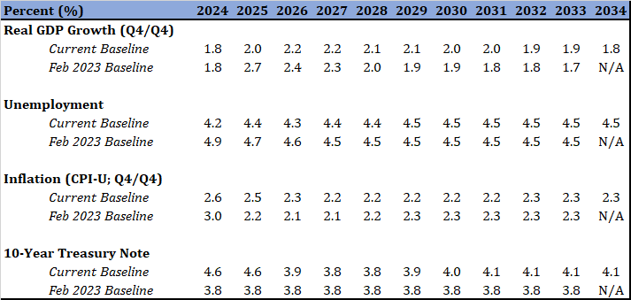 CBO projects real GDP growth to average 2.0 percent over the budget window. Over the same period (2024–2034), real GDP similarly averaged 2.0 percent in CBO’s February 2023 projection, but for somewhat different reasons. CBO’s 2023 projection had a uniquely pessimistic outlook for growth in 2023 (note that CBO has since released short-term, incremental updates) which the economy outperformed substantially. Accordingly, in CBO’s current baseline projections, the economy is beginning 2024 from a much stronger position than CBO previously estimated. With higher growth, CBO estimates inflation will be lower in the near term, but incrementally more persistent. Relatedly, CBO assumes interest rates will be higher over the budget window than previously estimated. Indeed, compared to CBO’s previous projection, the yield on a 10-year Treasury security would average 30 basis points higher than previously forecast over the budget window. Essentially, CBO was assuming something of a “hard landing” in 2023 that did not materialize.