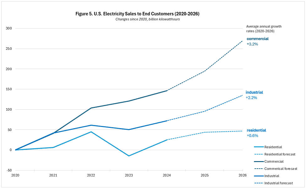 As shown in Figure 5, U.S. demand for electricity started to rise drastically from 2023, driven by demand in the commercial and industrial sectors. The commercial sector is estimated to have a 3.2-percent increase in consumption of electricity from 2020 to 2026, mostly due to the enormous amount of power demand from AI data centers. EIA estimates that the industrial sector will see a 2.2-percent increase in electricity consumption over the same period as a result of more manufacturing activities.
