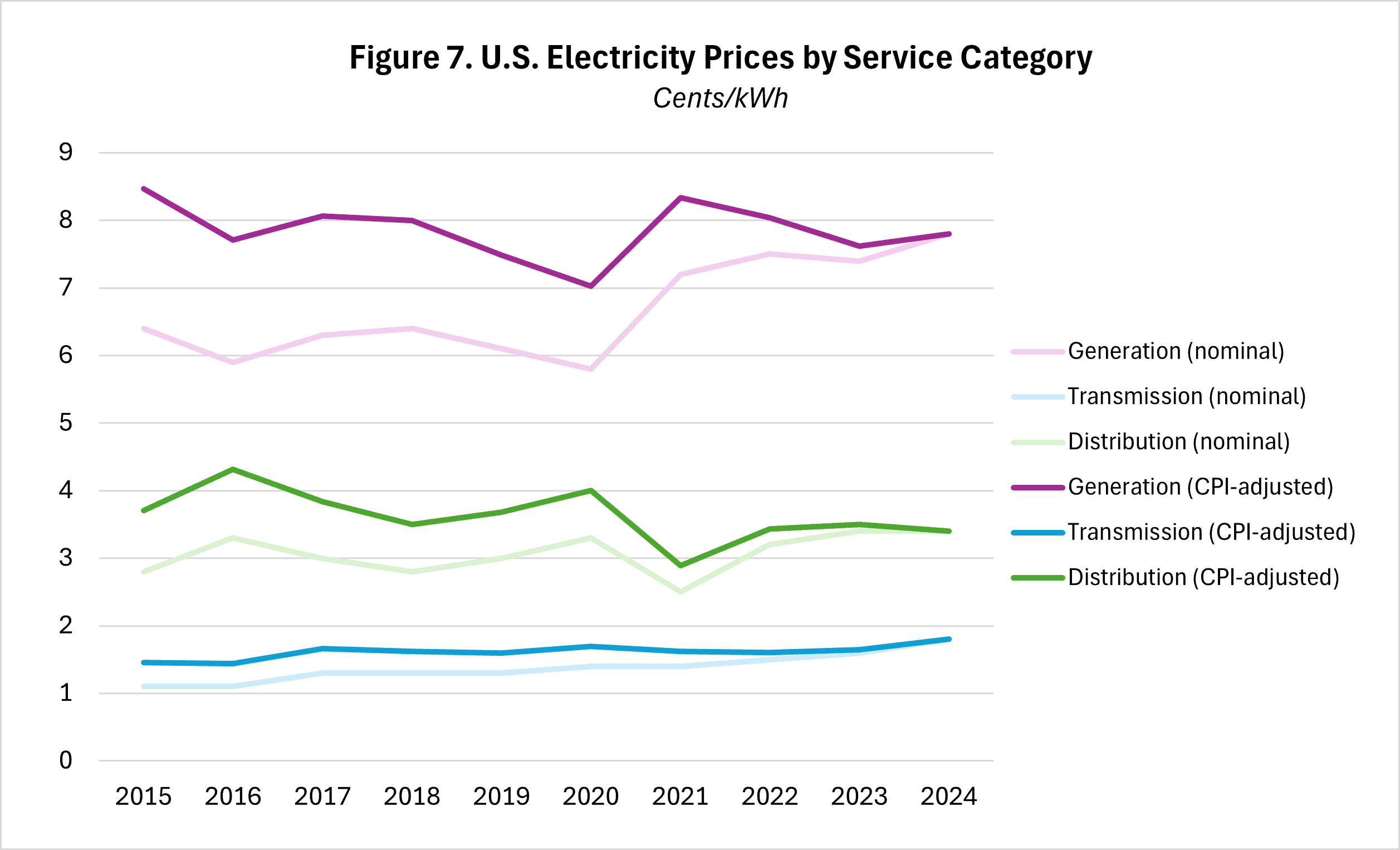 Generation costs make up about 60 percent of average electricity prices nationwide, with the remaining 40 percent of costs coming from transmission and distribution. As shown in Figure 8, U.S. average nominal prices of electricity generation, transmission, and distribution have been increasing since 2021. In real terms, both generation and transmission costs started to trend upward from early 2023, while distribution costs of retail electricity sales have stayed relatively flat. Utilities’ rising spending on transmission and distribution is driven by the capital investment requirement to upgrade the aging U.S. transmission and distribution infrastructure.
