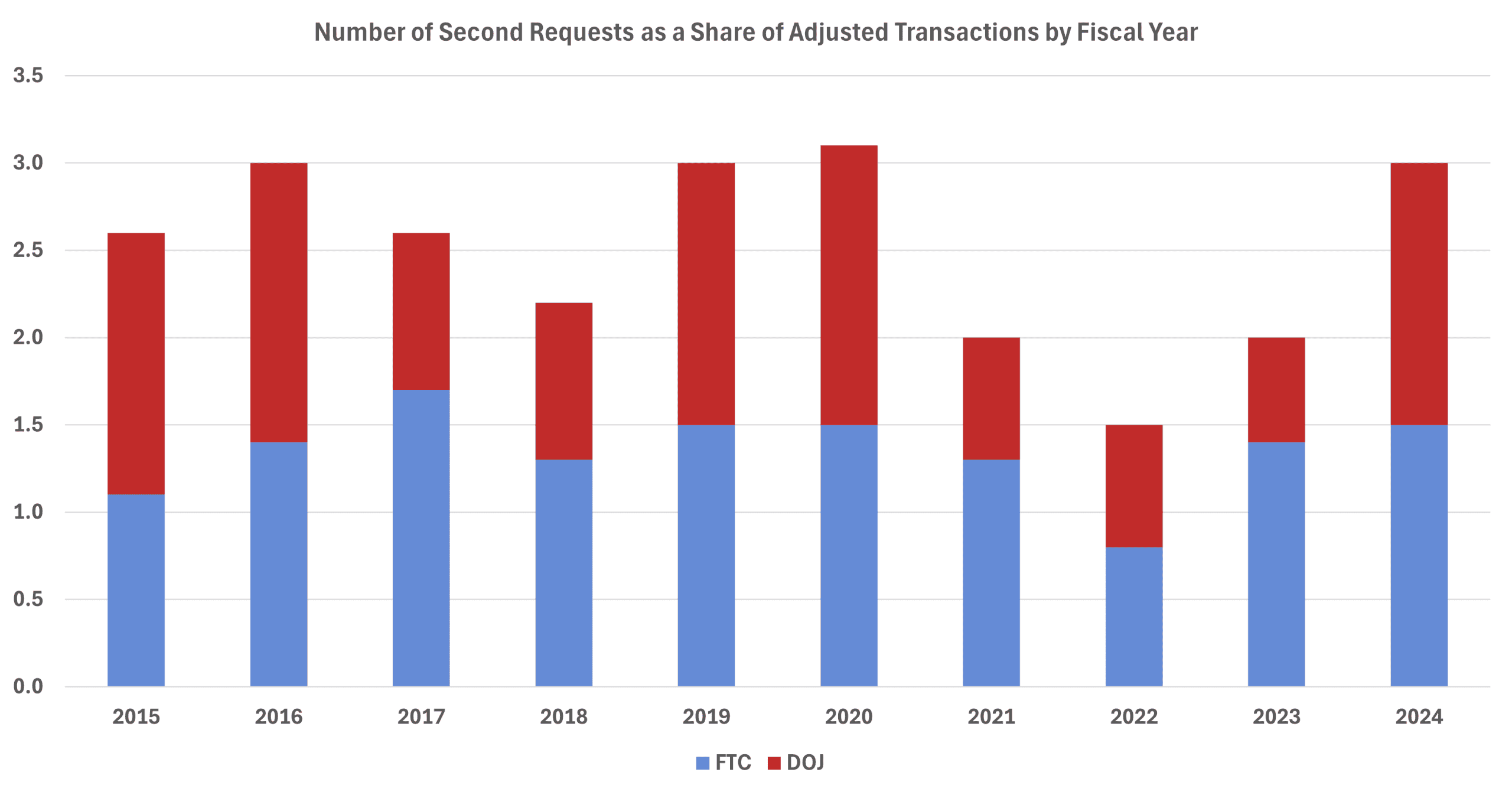 The HSR report also showed that the rate of second requests – a process that requires merging firms to submit additional information to the agencies – increased from the prior year but remained in line with historical norms at 3.0 percent of adjusted transactions, as shown in Figure 2.