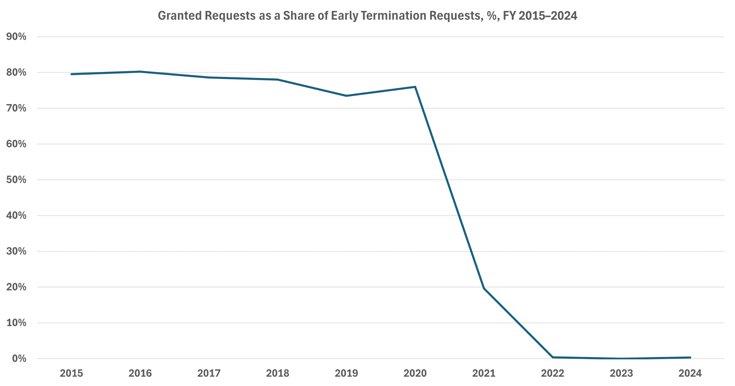 Fiscal year 2024 covers most of the final year in which the suspension of early termination was in effect. Early termination is a practice that allowed mergers and acquisitions that posed no competitive concerns to close quickly. Since 2021, when the early termination process was suspended four months into the fiscal year, grants of early termination largely evaporated. Just three of 858 requests were granted in FY 2024. Historically, between 70–80 percent of requests have been granted (Figure 3). Early termination has since been reinstated, but it is still unclear whether the FTC and DOJ will grant early terminations at the same historical rate.