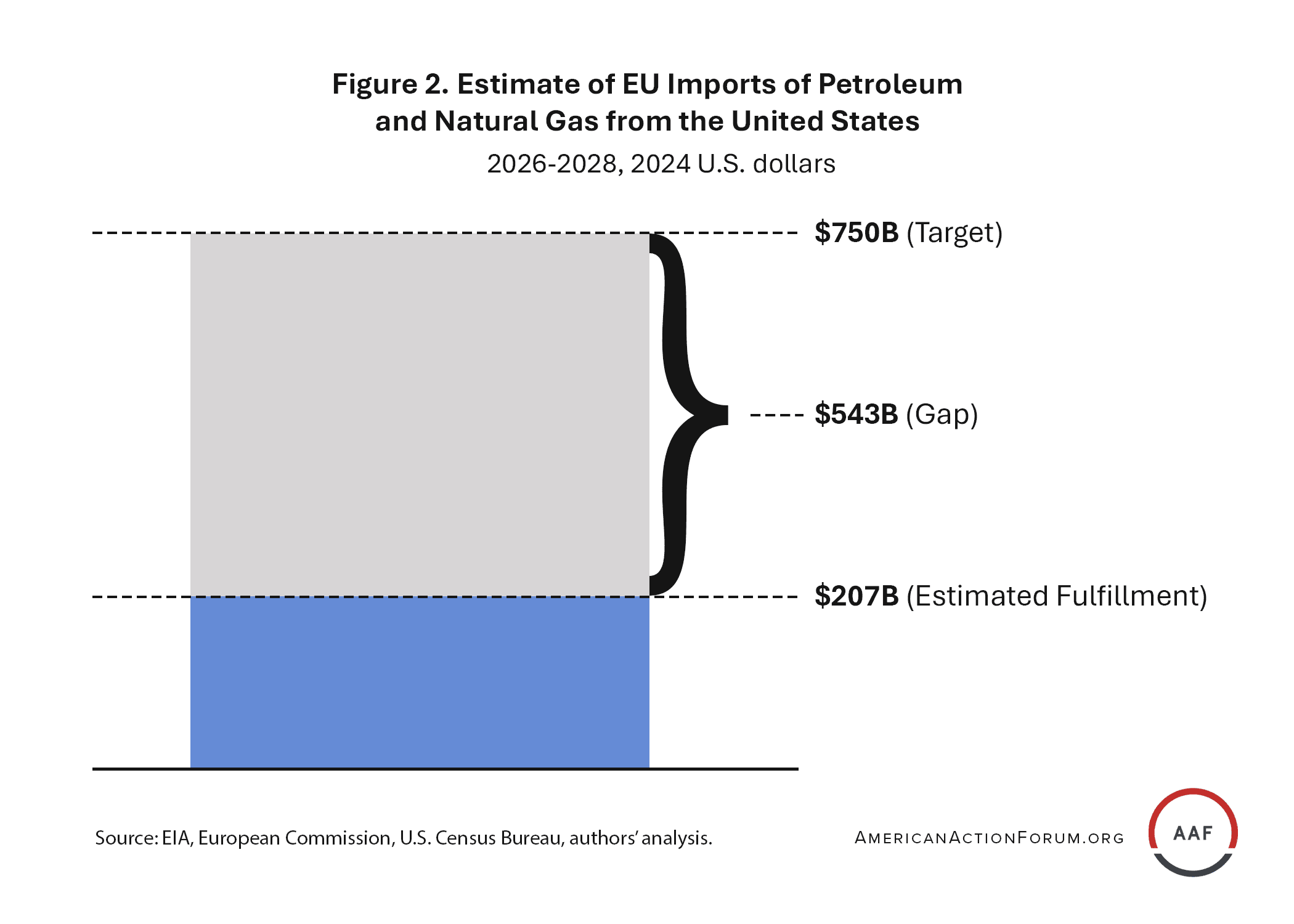 Total imports of petroleum and natural gas from the United States are projected to be $207 billion (in 2024 dollars) from 2026–2028 based on the Energy Information Administration’s (EIA) forecast. This number falls significantly short of the $750 billion target with an enormous gap of $543 billion to be fulfilled (see Figure 2). Note that this estimate does not include any U.S. nuclear fuel or reactor exports to the EU.