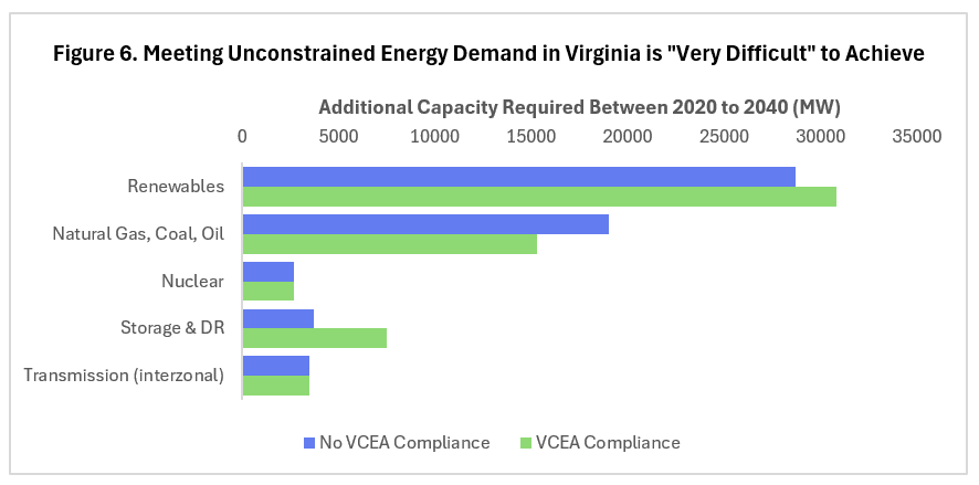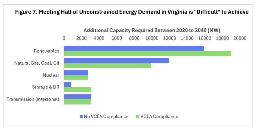 As shown in Figure 7, the report finds that meeting even half of the projected energy demand would “likely still be difficult,” requiring 37,800 MW and 34,400 MW of additional capacity in the VCEA-compliant and non-compliant scenarios by 2040, respectively.