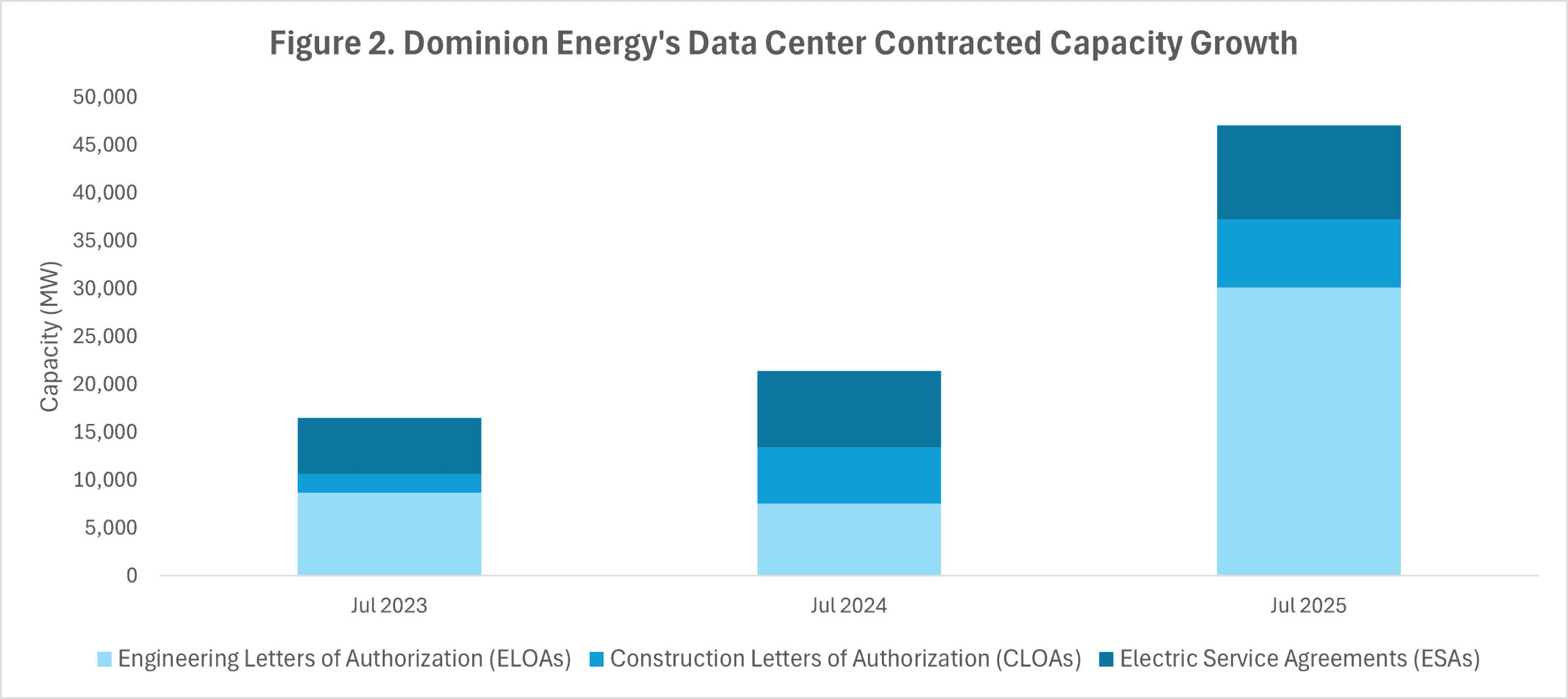 As shown in Figure 2, between July 2023 and July 2025, the total contracted capacity (ELOAs, CLOAs, and ESAs) between Dominion and its data center customers increased by 185 percent.