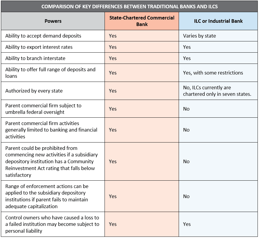 It was two other developments, however, that made ILCs the controversial topic that they are today. The first development is progressive expansion of powers by individual states over the last century. As a result, many ILCs perform activities largely identical to today’s top commercial banks, including in some cases deposit-taking activities, as the table below shows.
