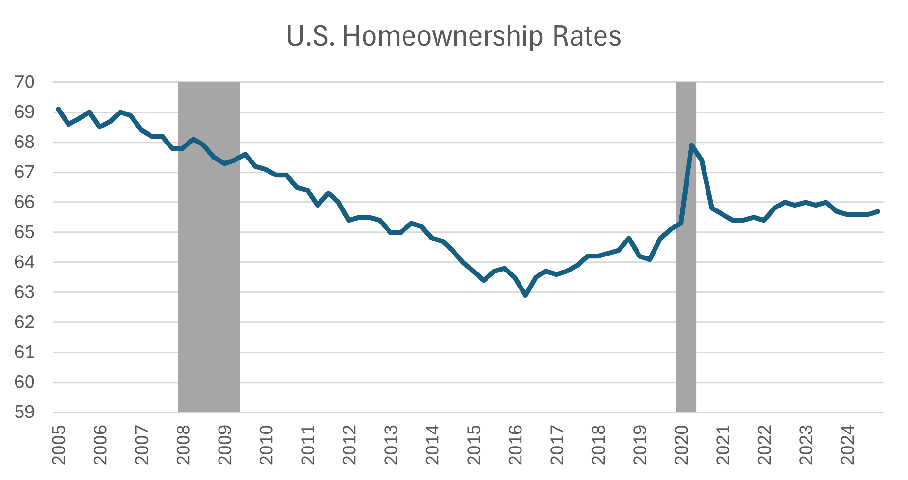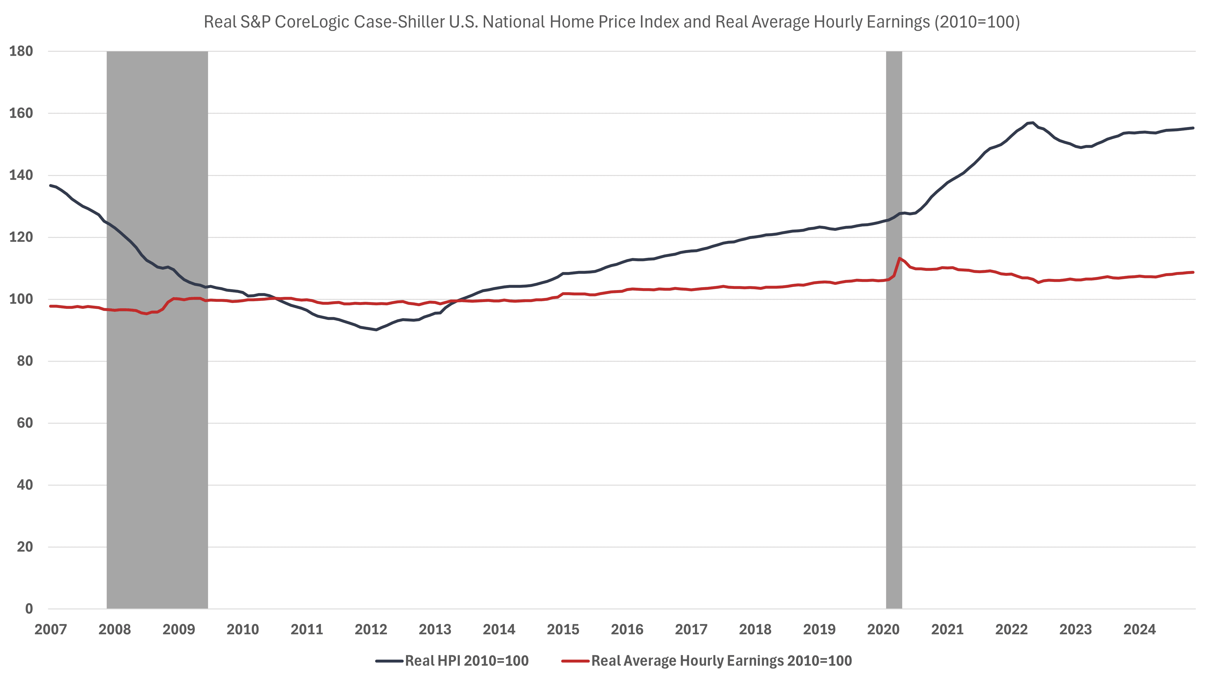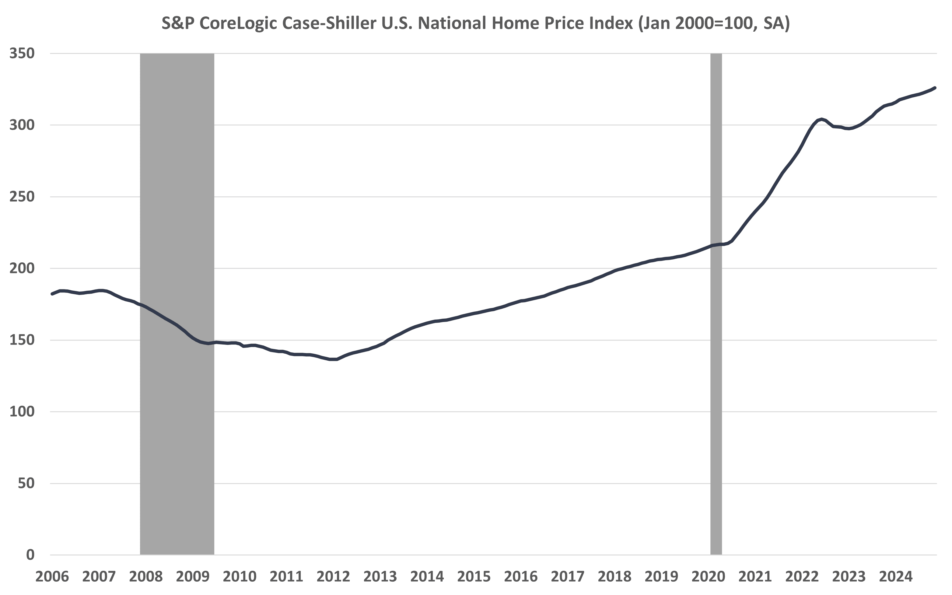 The surge in home prices should have sparked a supply boom, yet the supply of new single-family homes failed to keep pace with increased demand. Nationally, the annual pace of 1.05 million newly started privately owned single-family units in December 2024 is about the same as it was at the end of 2019. Rising construction costs – including the effects of tariffs on softwood lumber from Canada and gypsum from Mexico – and a lack of available labor hampered new construction. Other factors, including a surge in immigration, exacerbated the supply and demand imbalance, pushing home values higher. State and local restrictions on permitting and zoning also inhibit supply from coming to the market.