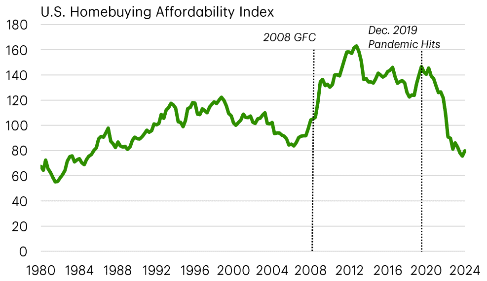 The graph shows that home affordability peaked in 2012 following the home-price decline during the financial crisis combined with low mortgage rates. Currently, homebuying affordability is at its lowest level since the mid-1980s as home prices and mortgage rates soared.