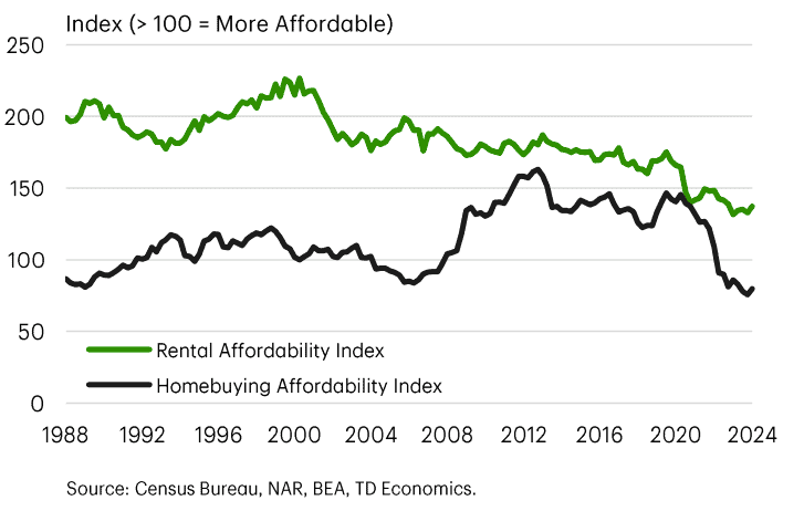 As a result of the financial crisis, an estimated 3.8 million households lost their homes to foreclosure, according to a United States Government Accountability Office (GAO) report. Many of these households, as a result, entered the rental market, driving up demand for rental housing. More recently, as homes became increasingly unaffordable, even more households were pushed to rent. Rental vacancies – the share of rental units that are unoccupied – fell from a high of 10.6 percent in 2009 to 6.7 percent through the first three quarters of 2024. Amid this increase in demand for rentals, affordability declined but homes remained affordable relative to income and homebuying (Figure 4).