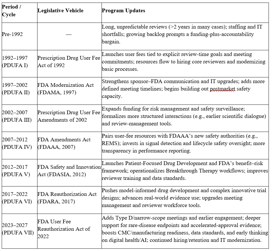 PDUFA operates on a five-year cycle. Before each reauthorization, FDA holds public meetings to identify needs and priorities, negotiates with the regulated industry on a draft commitment letter, and invites public comment before submitting the final package to Congress. The commitment letter becomes the operational blueprint: performance goals for review timelines (standard versus priority), clock-start definitions, and goal-date reporting; meeting frameworks (e.g., Type A/B/C/D) with scheduling and response-time targets; and program enhancements such as reviewer hiring plans, training, data standards, and IT deliverables. Transparency is built in: FDA publishes performance reports tracking on-time actions, meeting timeliness, and staffing progress. The structure incentivizes early, frequent, and focused sponsor-FDA engagement, which tends to yield higher-quality submissions and fewer late-cycle surprises. The table below shows the evolution of PDUFAs over the years.
