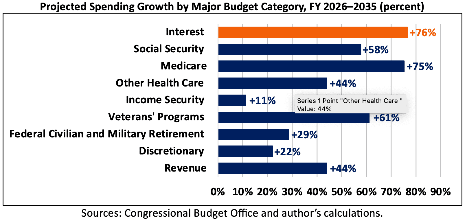 - Over the decade, interest payments are projected to grow by an estimated 76 percent, from $1.0 trillion in FY 2026 to $1.8 trillion in FY 2035; interest is projected to grow faster than any major budgetary category.