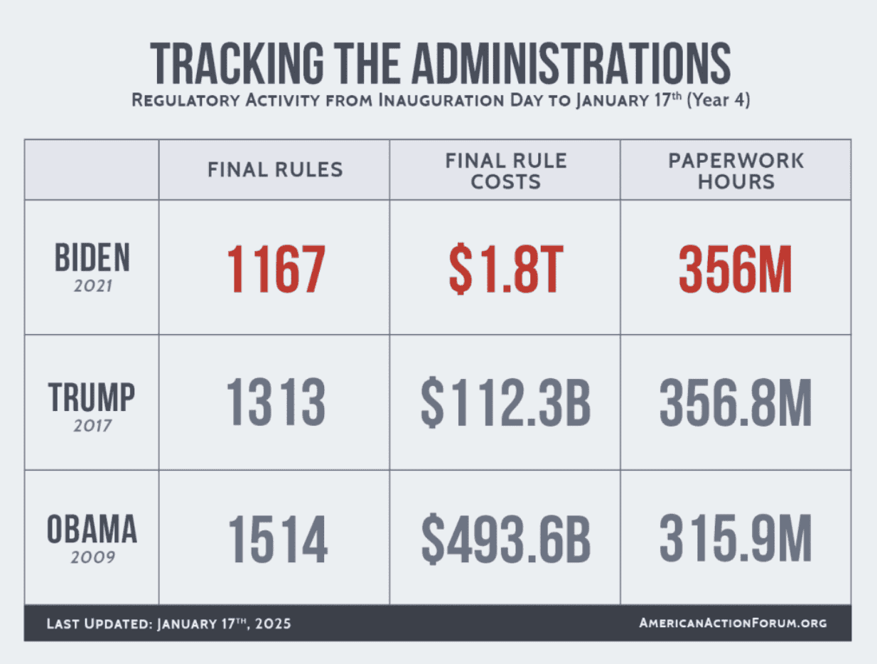 As AAF has previously noted, the Biden era’s regulatory cost total of $1.8 trillion is on “a level of magnitude comparable to federal budget deficits and the gross domestic product of major countries.” While the past year’s rulemaking activity may have pushed this sum way over the top, it was built on a steady foundation of agency action in the early years, and although initial details are somewhat scarce, one expects the incoming Trump Administration to head in a very different direction. As such, the Biden “record” is likely secure for at least the next few years – and given its sheer scale, for some time thereafter.