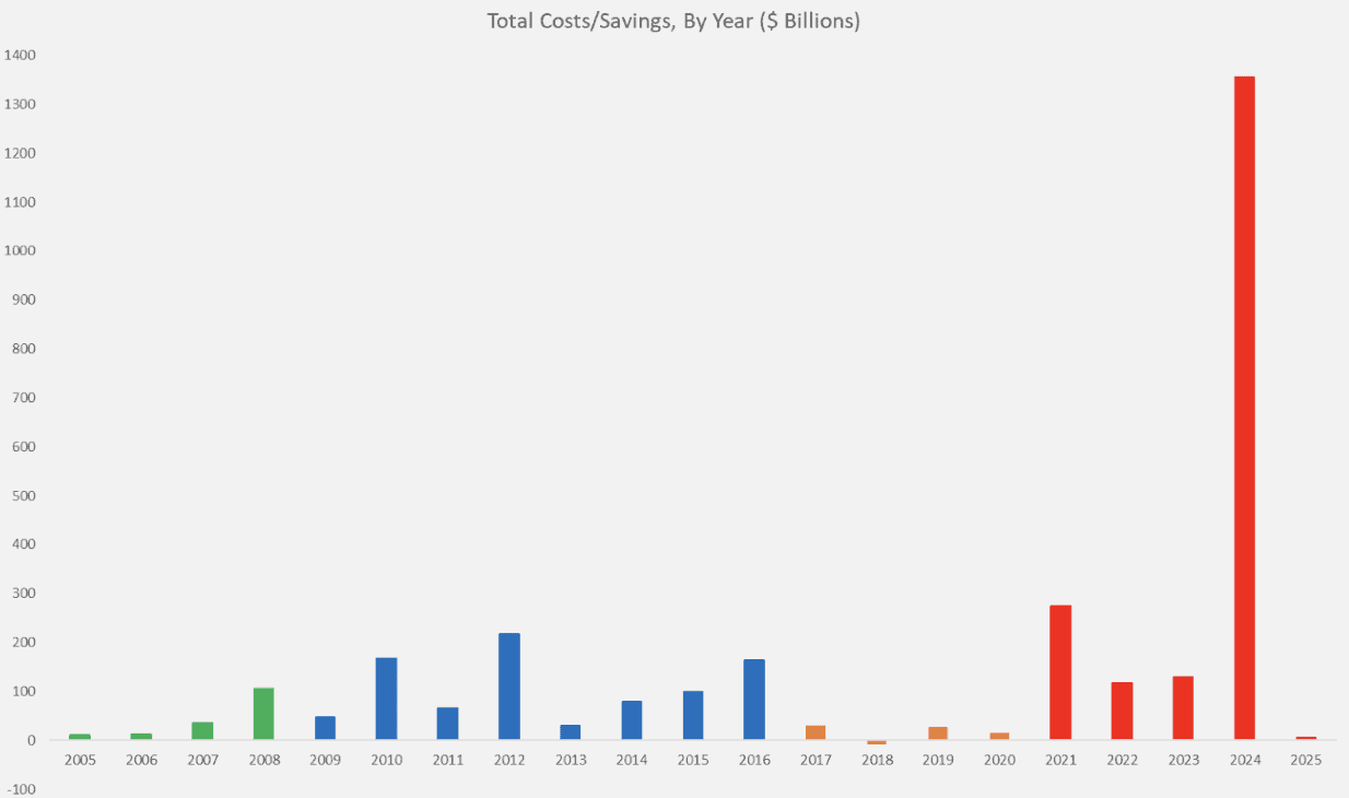While the 2024 total represents a massive historical outlier, the overall Biden trend points to consistently high levels of costs across the board. Out of the 20 full calendar years currently logged in RegRodeo’s data, the “Biden Years” represent the 1st (2024), 3rd (2021, when one excludes the $72 billion in costs attributable to Trump), 6th (2023), and 7th (2022) costliest years on record.