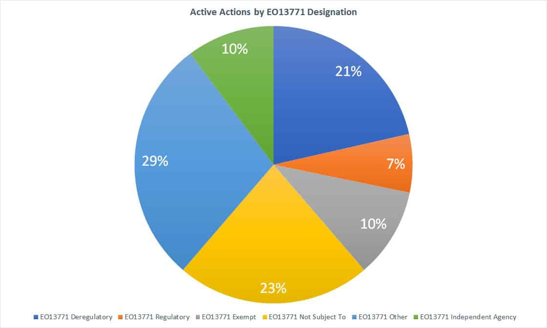 - Of the 2,399 active actions listed in the latest Unified Agenda of Regulatory and Deregulatory Actions, 514 are designated as deregulatory (21 percent) versus 163 designated regulatory (7 percent).