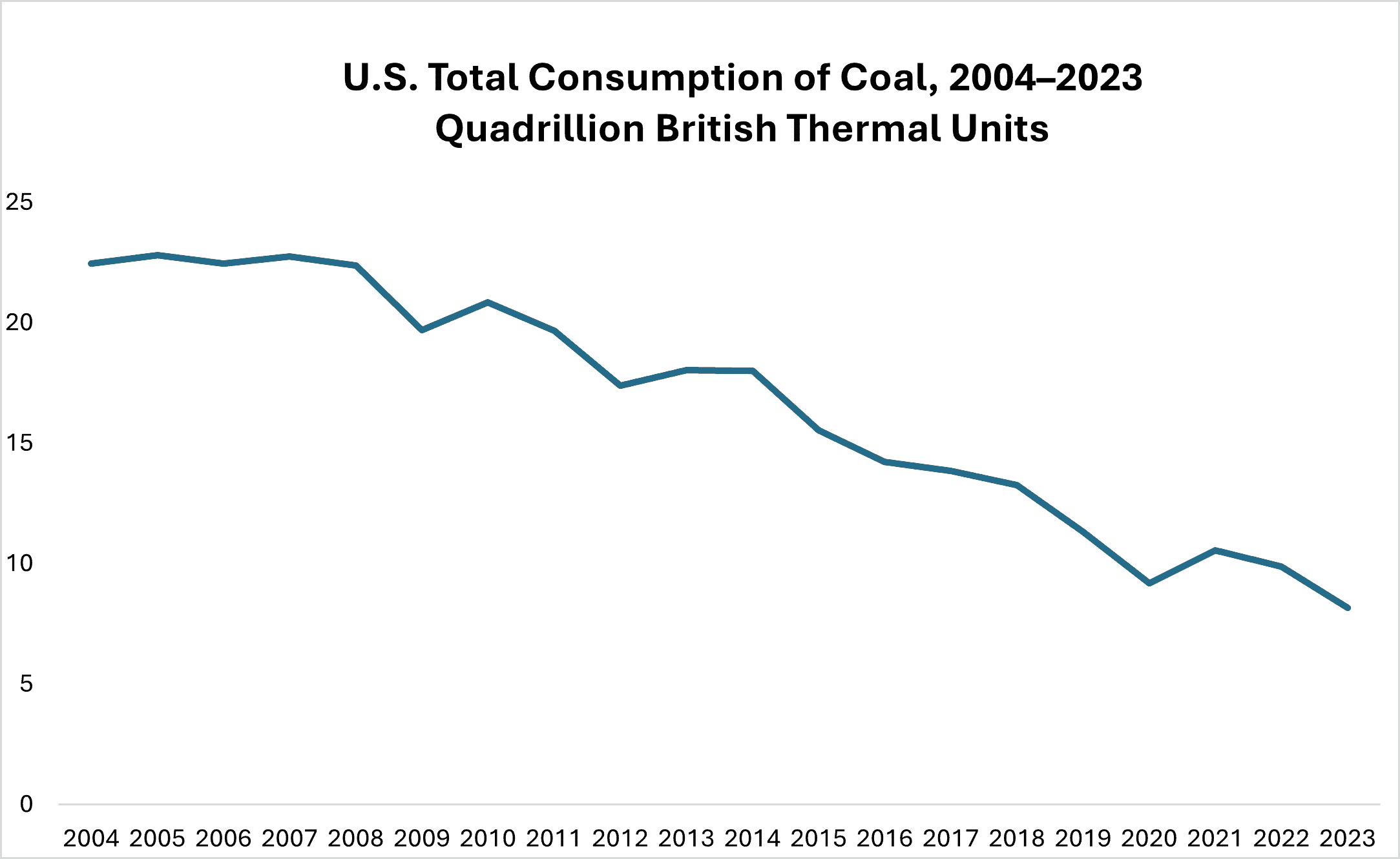 As shown in the chart below, U.S. total consumption of coal has declined over the past two decades. U.S. electricity generated by coal peaked in 2011 at 317,600 megawatts (MW) and has since been declining consistently by about 10,000 MW of capacity reduction annually.