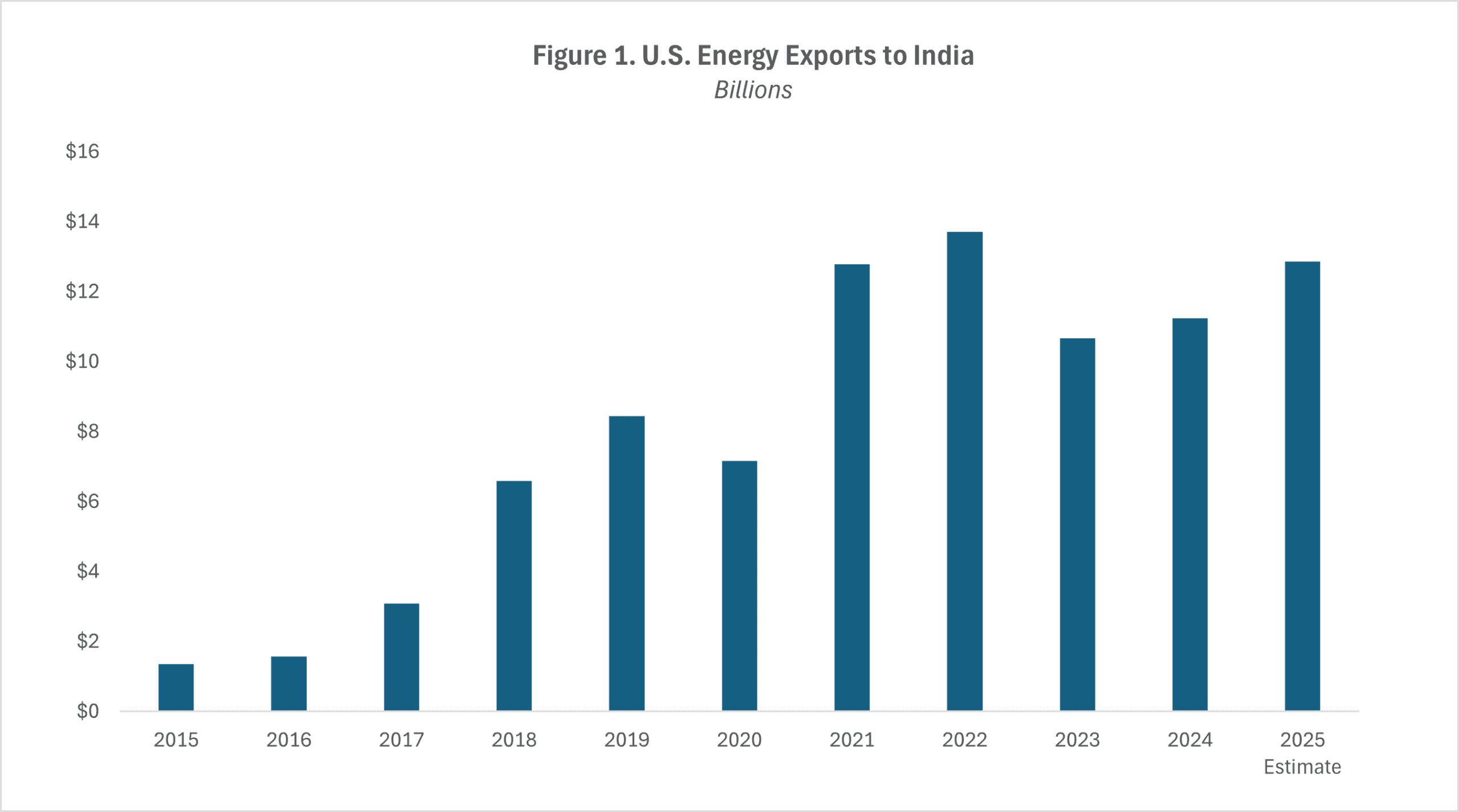 The largest categories of U.S. energy exports included crude petroleum, coking coal, and natural gas. As displayed in Figure 1, U.S. energy exports to India have remained relatively flat since 2022 despite a large growth spurt between 2015–2021.