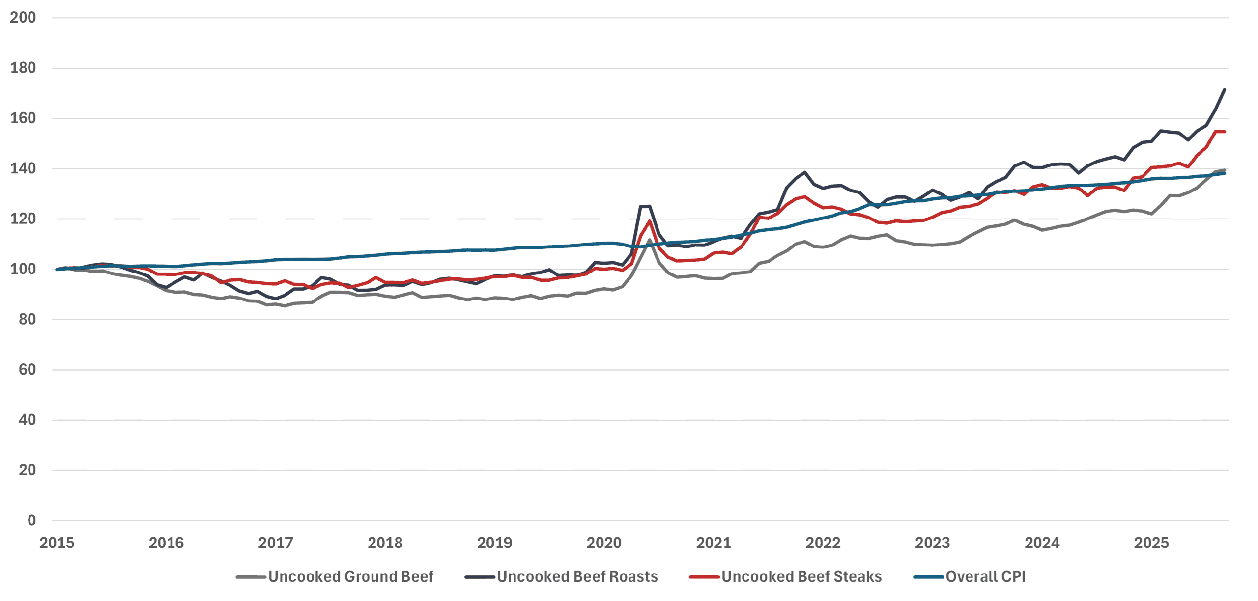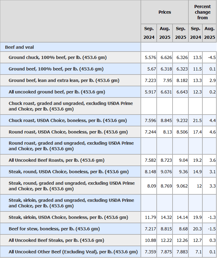 Beef prices have put a noticeable dent in consumers’ wallets, outpacing overall inflation since mid-2023. The price of all uncooked ground beef rose to $6.64 per pound, a 12.3- percent increase from a year ago in September 2025. The price of all uncooked beef steaks reached $12.26 per pound, up 12.7 percent from a year ago, while uncooked beef roasts surged 19.2 percent to $9.04 per pound.