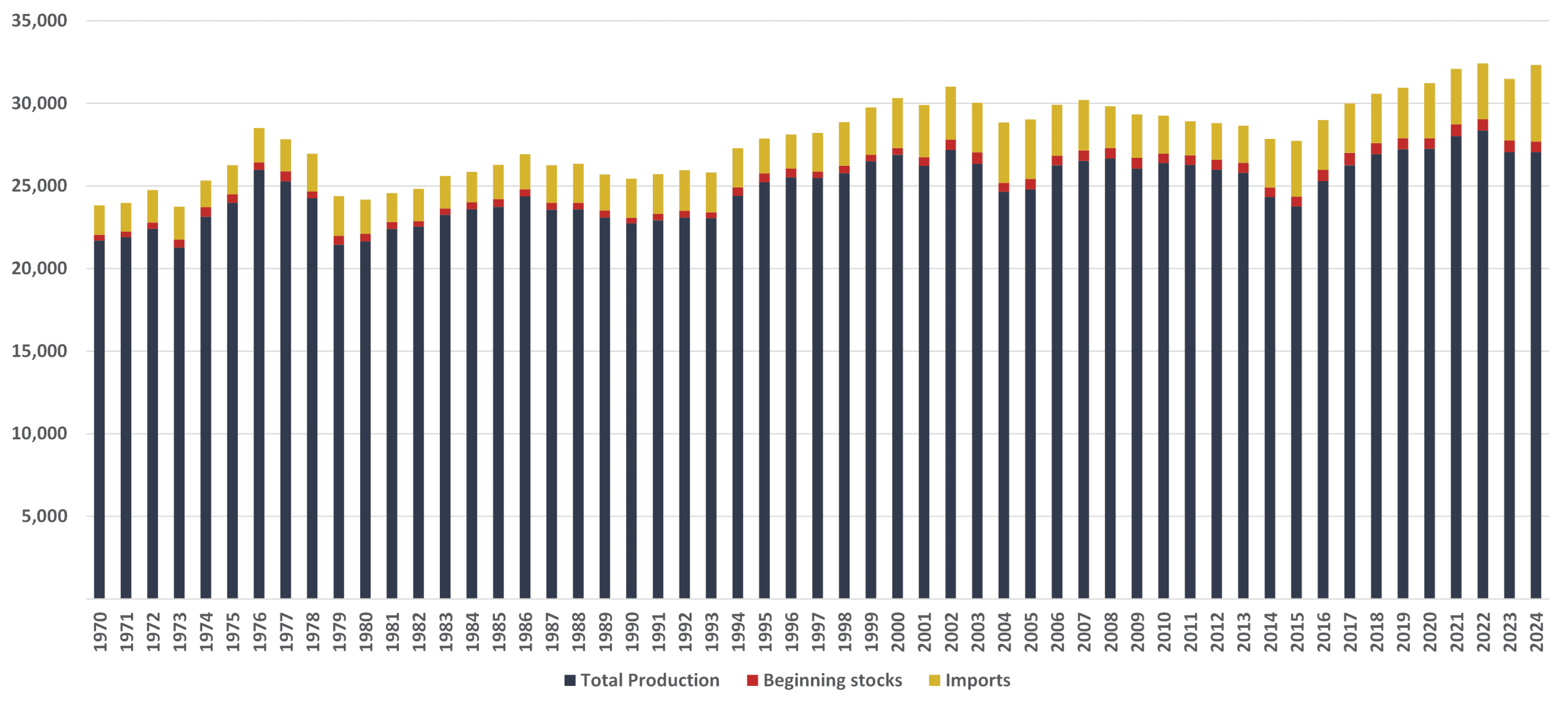 Data from the USDA show that supply increased 3 percent in 2024 to 32,324 million pounds. Domestic production, however, was unchanged from the prior year while beginning stocks – which measures the amount of beef remaining from the previous year’s production – sank 11.9 percent. The gain in supply resulted from a 24-percent surge in imports.