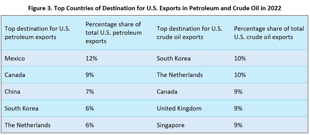 Canada, Mexico, Saudi Arabia, Iraq, and Colombia are the top five countries of origin for U.S. petroleum and crude oil imports. (Figure 2) Canada is a particularly important oil and petroleum trading partner, as the United States imported 52 percent of its petroleum and 60 percent of its crude oil from Canada in 2022. Mexico, Canada, China, South Korea, The Netherlands, United Kingdom, and Singapore are the top countries of destination for U.S. petroleum and crude oil exports. (Figure 3)