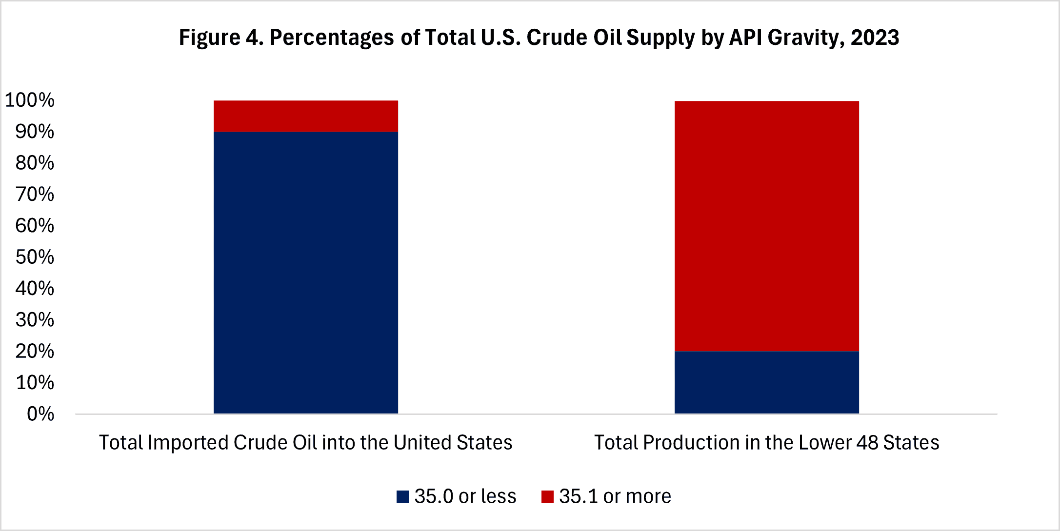 There is a great variety of crude oils in terms of their density and composition. API (American Petroleum Institute) gravity (expressed in degrees) is a common metric to measure the weight of crude oil compared to water. The higher the API gravity, the lighter the crude oil. Light crudes are typically higher than 38 degrees in API gravity, whereas heavy crudes are lower than 22 degrees in API gravity. Crude oils that are between 22 and 38 degrees in API gravity are intermediate crudes. For example, in 2023, most of the imported crude oil into the United States was heavy whereas most of the crude oil produced in the lower 48 states was light (Figure 4).