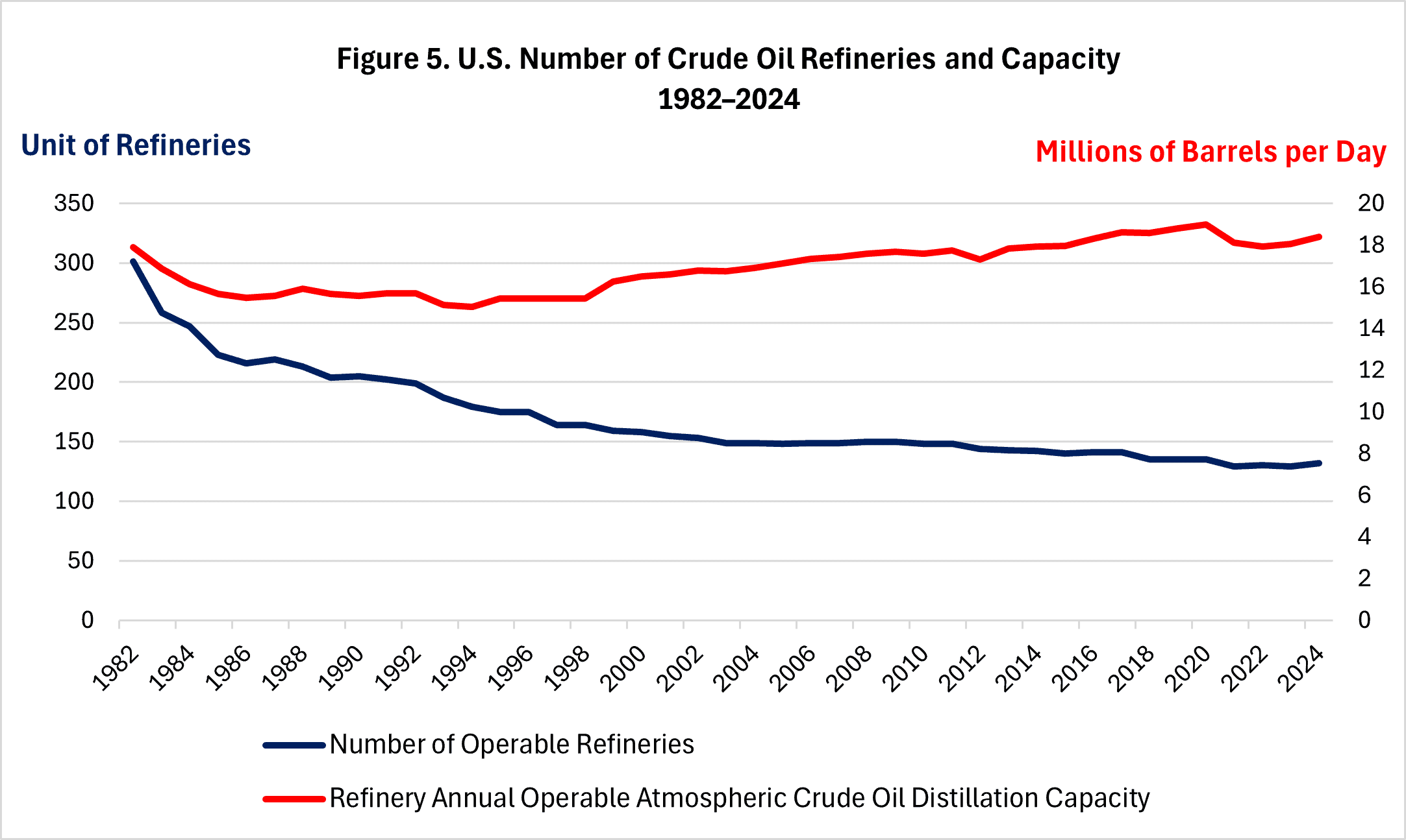 U.S. refineries were built and designed for processing heavy crudes because they were widely available in the global market before the shale boom. Meanwhile, the number of operable crude oil refineries in the United States dropped more than 50 percent from 301 units in 1982 to 132 units in 2024. (Figure 5) No new refineries have been built in the United States since 1982. Yet U.S. crude oil refining capacity has stayed relatively static over the past several decades due to technological advancements and upgrades of existing plants.