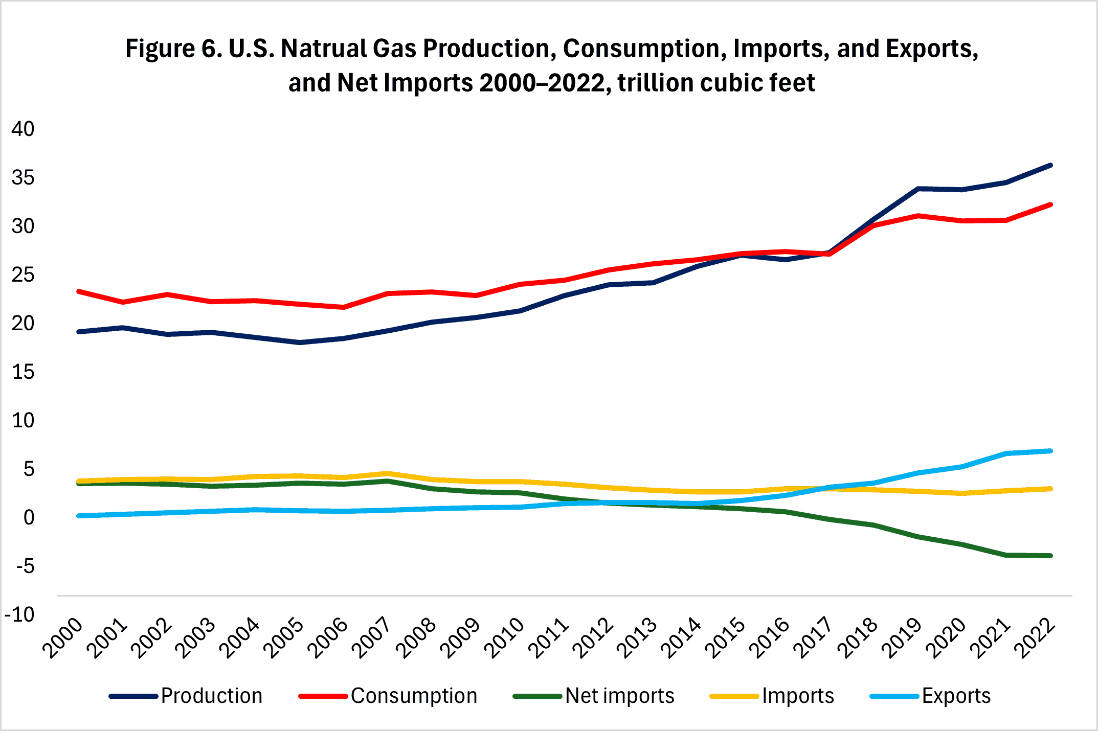 The United States became a net exporter of natural gas in 2017, with net exports of 0.12 trillion cubic feet. Its natural gas imports peaked in 2007 at 4.6 trillion cubic feet and dropped to 3 trillion cubic feet in 2022. Its natural gas exports grew significantly from 1.8 trillion cubic feet in 2015 to 6.9 trillion cubic feet in 2022. (Figure 6)