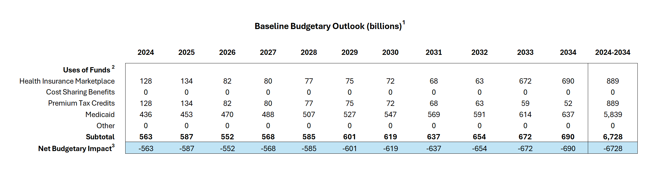The MRP demonstrates savings of $670 billion to the federal budget compared to baseline estimates. By summing the annual differences between current policy (baseline) and MRP estimates, an average net saving of $67 billion is predicted for each fiscal year. The tables below demonstrate the net savings for each fiscal year comparing the H&E baseline to the MRP budget from 2024 to 2035. Table 1 demonstrates the 2024 baseline budgetary estimates, including federal spending in the individual market as well as Medicaid. Table 2 highlights the budgetary outlook of the MRP, with the final table demonstrating net budgetary savings specifically from Medicaid.