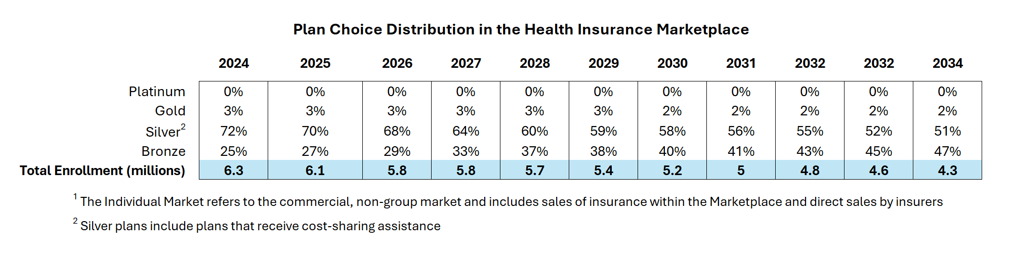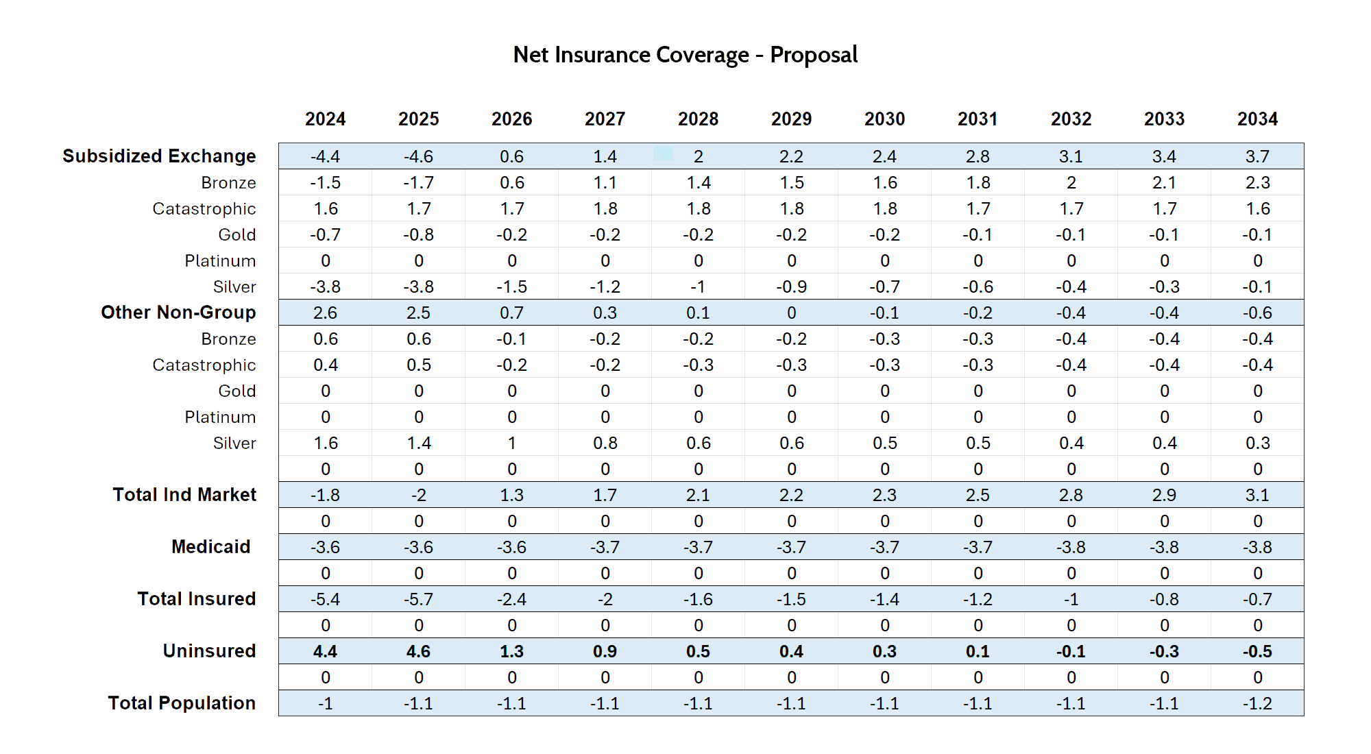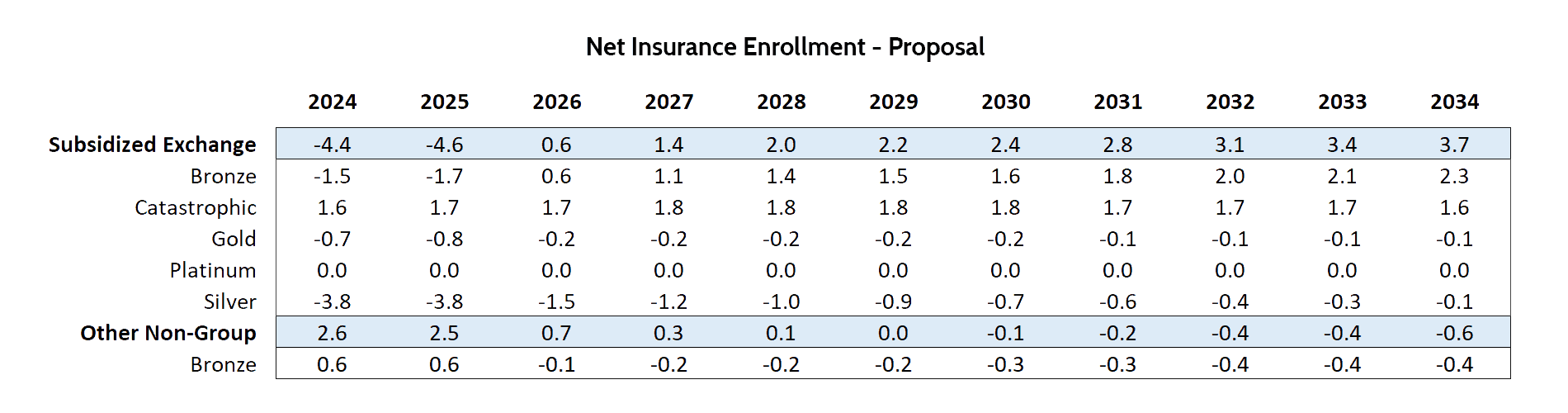 - Coverage Impact: Under H&E’s considered reforms, Medicaid enrollment would decrease by 3.8 million by 2034. Enrollment in Bronze and Catastrophic plans on the subsidized exchange would potentially increase by 2.3 million and 1.6 million, respectively. Minimal changes in enrollment were observed for Silver, Gold, and Platinum plans.