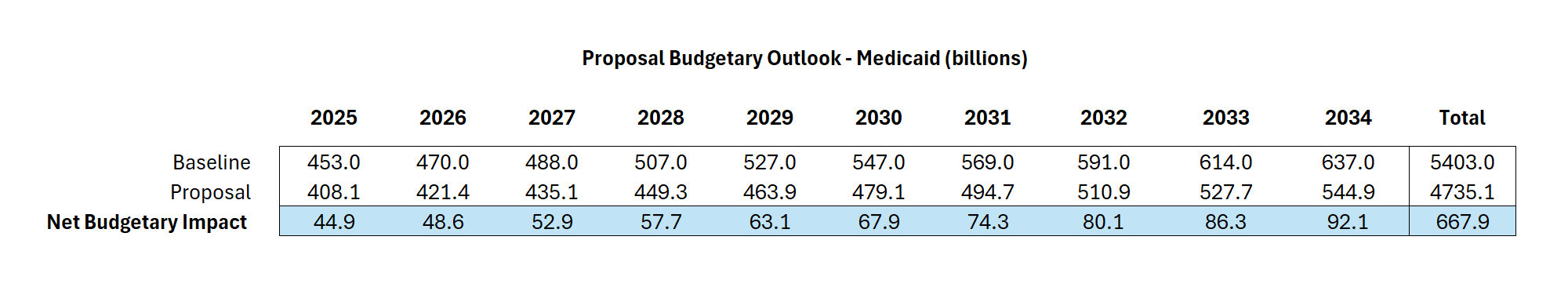 - Budget Impact: Compared to H&E’s 2024 baseline, H&E’s projection of the Medicaid noted block grant or per-capita cap provision would decrease federal spending by approximately $670 billion from 2025–2034, or $67 billion per year.