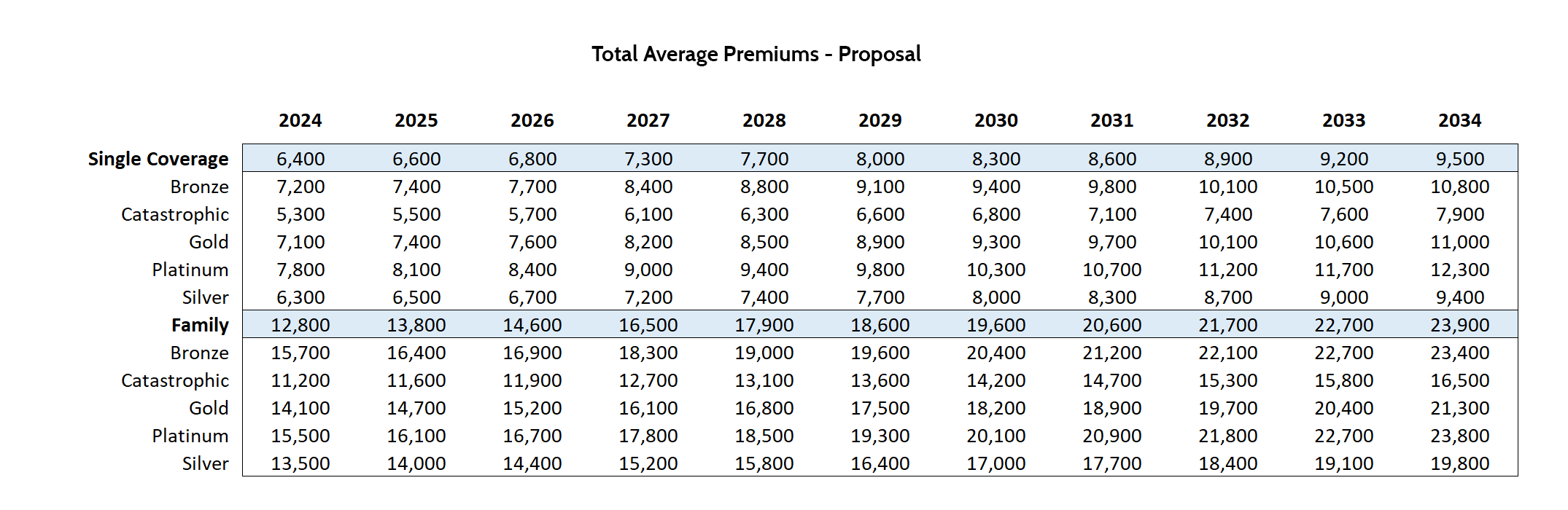 Under the MRP, annual premiums are projected to fluctuate over the 10-year window. Annual premiums for Bronze and Catastrophic plans in both single coverage and family coverage are predicted to decrease moderately – 14 percent and 5 percent, respectively, for single coverage; 12 percent and 9 percent for family coverage. Annual premiums for single coverage and family coverage for Silver, Gold, and Platinum are expected to increase – 24 percent, 17 percent, and 16 percent, respectively, for single coverage, 29 percent, 32 percent, and 34 percent, respectively, for family coverage by 2034. These changes are reflected in the tables below. Table 9 provides the net difference premiums between the 2024 baseline estimates and Table 10 demonstrates total average premium estimations from the MRP.