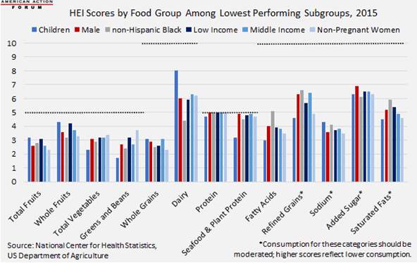 As for which foods at-risk populations need to consume more and which to consume less, they are the same foods that all Americans generally need to consume more or less: more whole grains and fatty acids and less sodium and saturated fats. Most Americans would also benefit from greater consumption of fruits, vegetables, and dairy. Because of the consistency of nutritional deficiencies across subpopulations, interventions targeted at populations most in need have the potential to improve the die