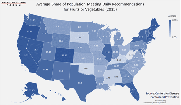 States in the Southeast and Midwest have the lowest shares of their populations meeting fruit and vegetable guidelines.[xiii] Despite having the country’s highest concentration of farms, these states tend to grow corn, grains, cotton, and soybeans.[xiv] Alaska is a surprising outlier with a relatively high share (12.5 percent) of its population meeting such recommendations despite having the lowest agricultural sales in the country.[xv]