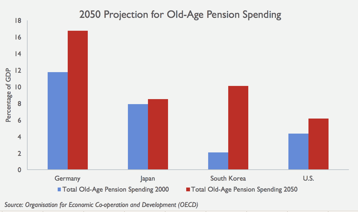 These aging trends will only aggravate the stress of entitlement programs on the budgets of countries like Germany, Japan, and South Korea. The effects will be most prominent on the public pension systems, but the impact will be much deeper. The Organisation for Economic Co-operation and Development (OECD) found that globally, “spending components that are sensitive to the age structure of the population represent between 40 and 60 percent of total public spending.” With that order of effect, it is difficult to project exactly how aging populations will impact national budgets, but it is clear that the stress on entitlement spending will be significant.