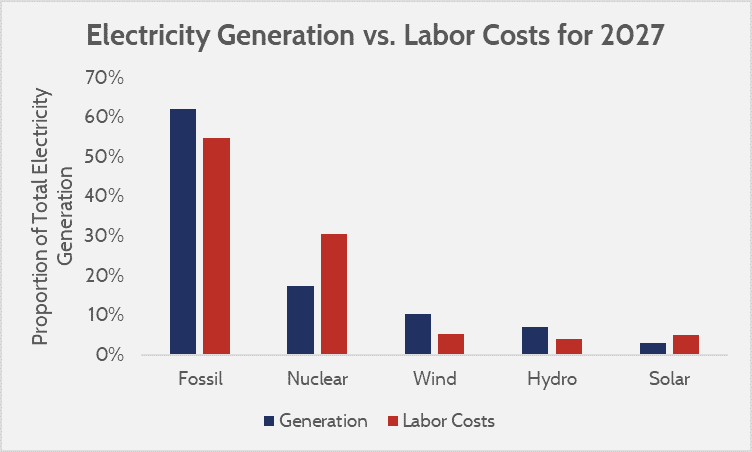 The graph and chart below show the ratio of labor requirements of workers for each electricity source to the EIA’s projections for electricity generation and produces an estimate of the potential labor costs for each source in 2027.