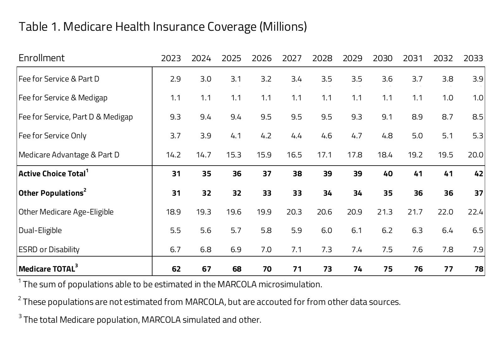 - The Medicare market includes an estimated 62 million U.S. residents in 2023, with 14.2 million covered in the non-employer facilitated Medicare Advantage combined with a pharmacy benefit. The total size of the Medicare market is estimated to increase throughout the budget window, growing to 78 million in 2033.