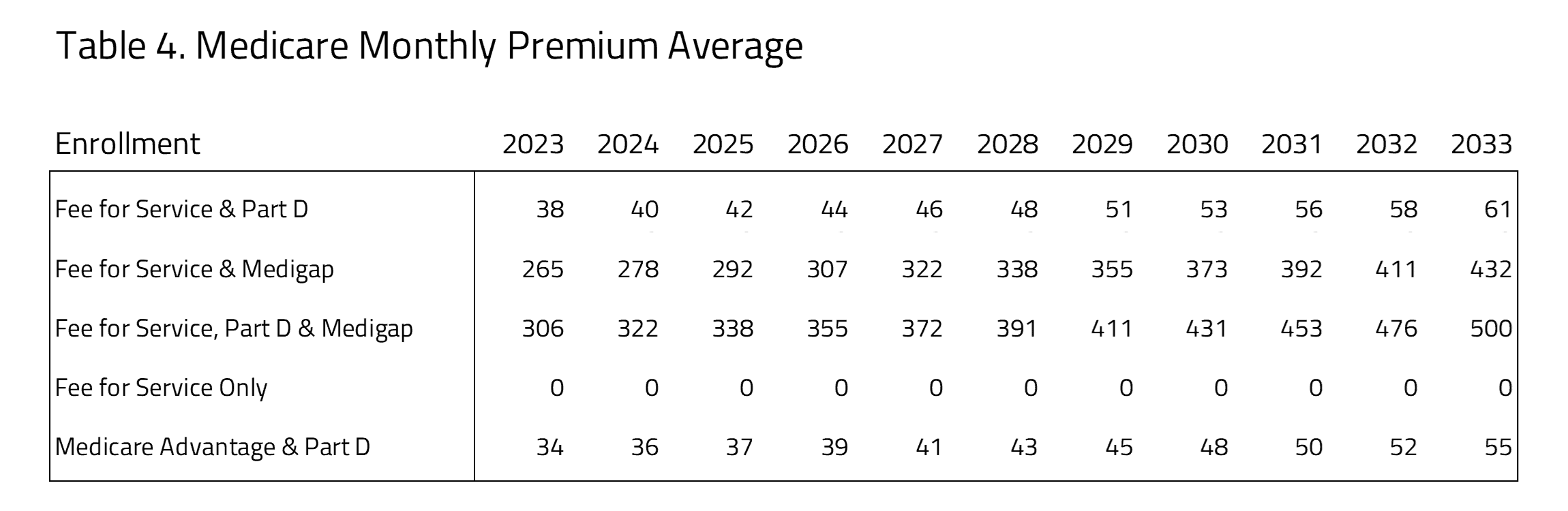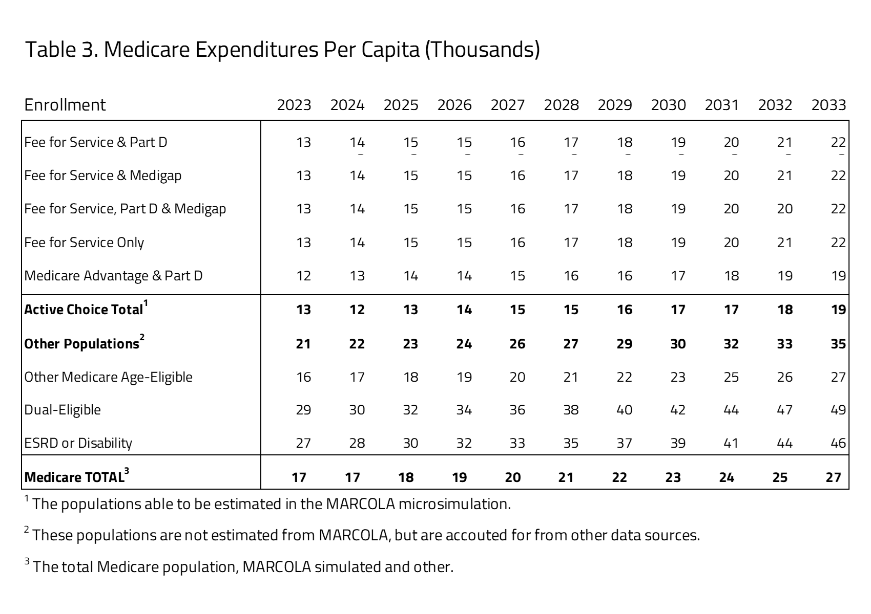 Using the project Medicare beneficiary population size and expenditure, H&E estimates the per-capita cost of each Medicare program category. As seen in Table 3, the active-choice Medicare consumer choice group there is little variation between the subgroups. The one significant difference is in the Medicare Advantage and Part D subgroup, where average per-beneficiary cost is $12,000 in 2023, compared to the other groups’ $13,000 average cost. This difference is maintained throughout the budget window with costs for Medicare Advantage and Part D averaging $20,000 by 2033 and the other subgroup, including all the FFS choices, having higher average per-beneficiary costs of $22,000 in 2033.